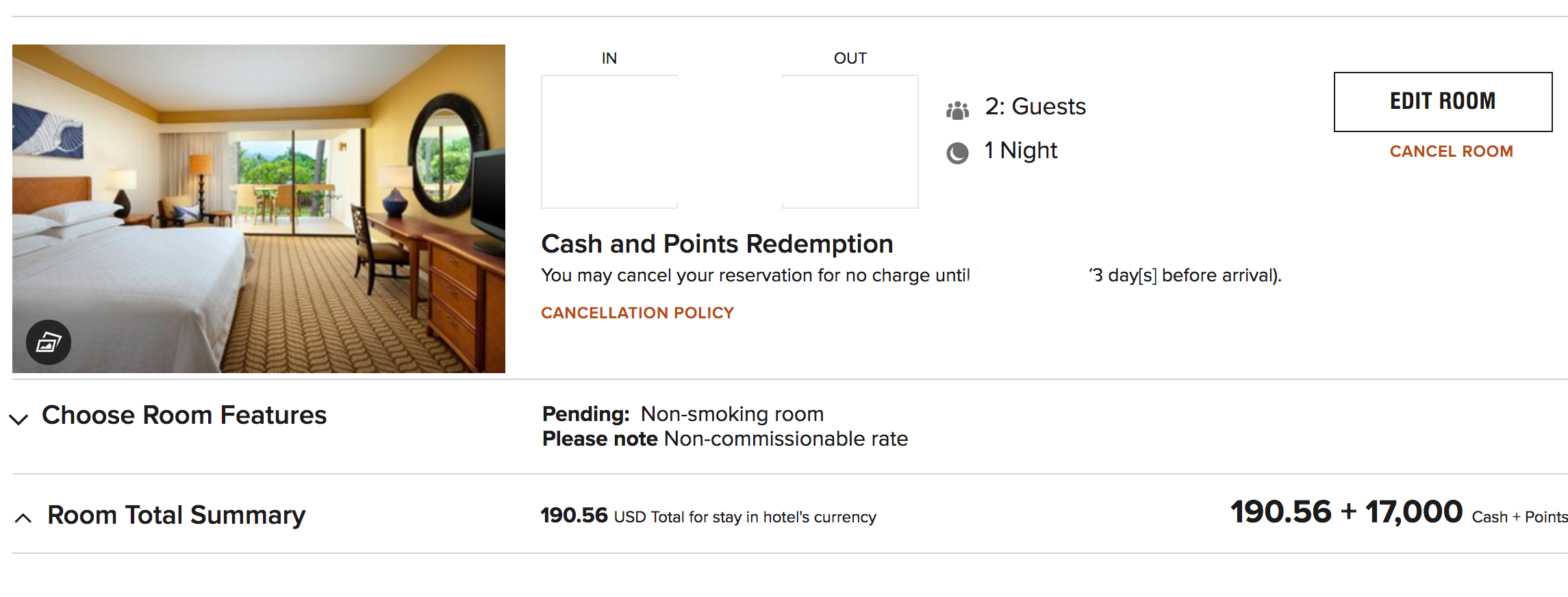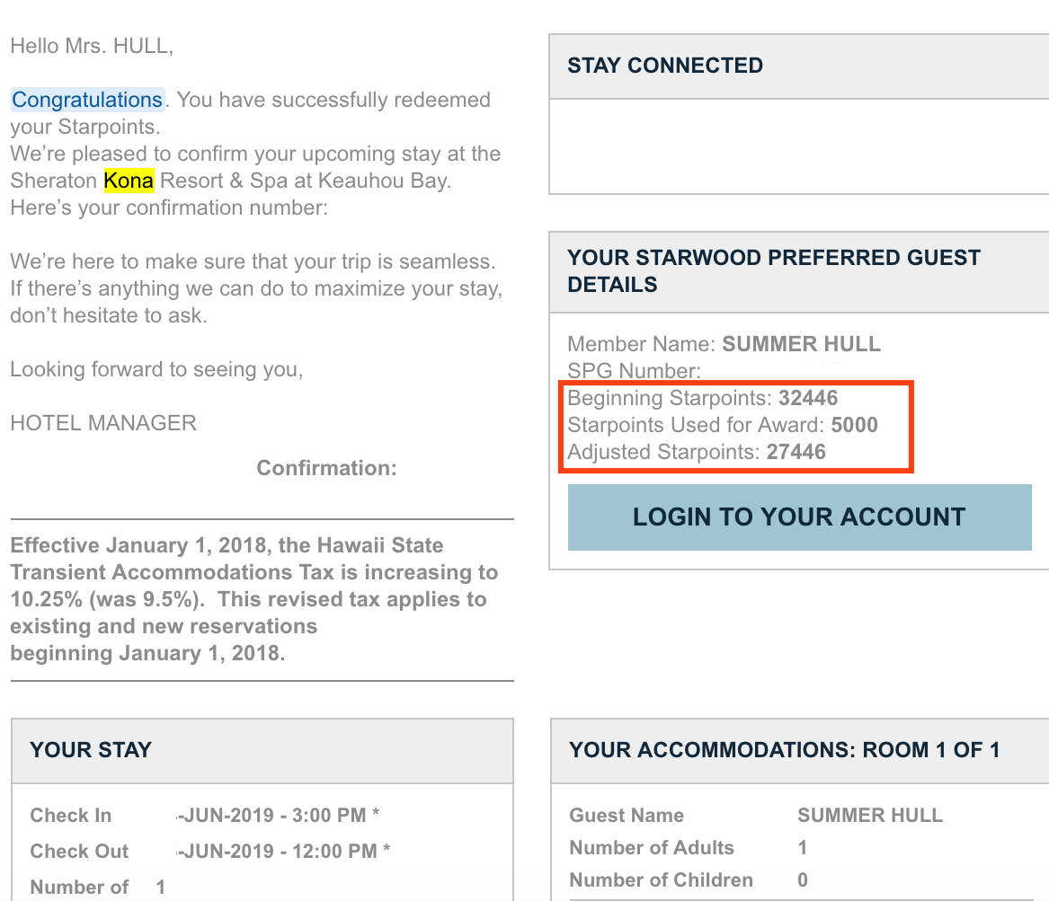 Back in February 2018, I booked two rooms for two nights at a Starwood (now Marriott) hotel in Hawaii for my parents and my own family for a June 2019 trip. These rooms were booked using the former SPG cash-and-points rate. Since the trip is coming up soon, I logged on to Marriott to check the reservation and noted that it had multiple problems. First, the rate for each room had changed from 15,000 points (then 5,000 SPG points, which converted at a 1:3 ratio) and $75 per night to 17,000 points and $140 per night ($190 per night once you include resort fees and taxes).