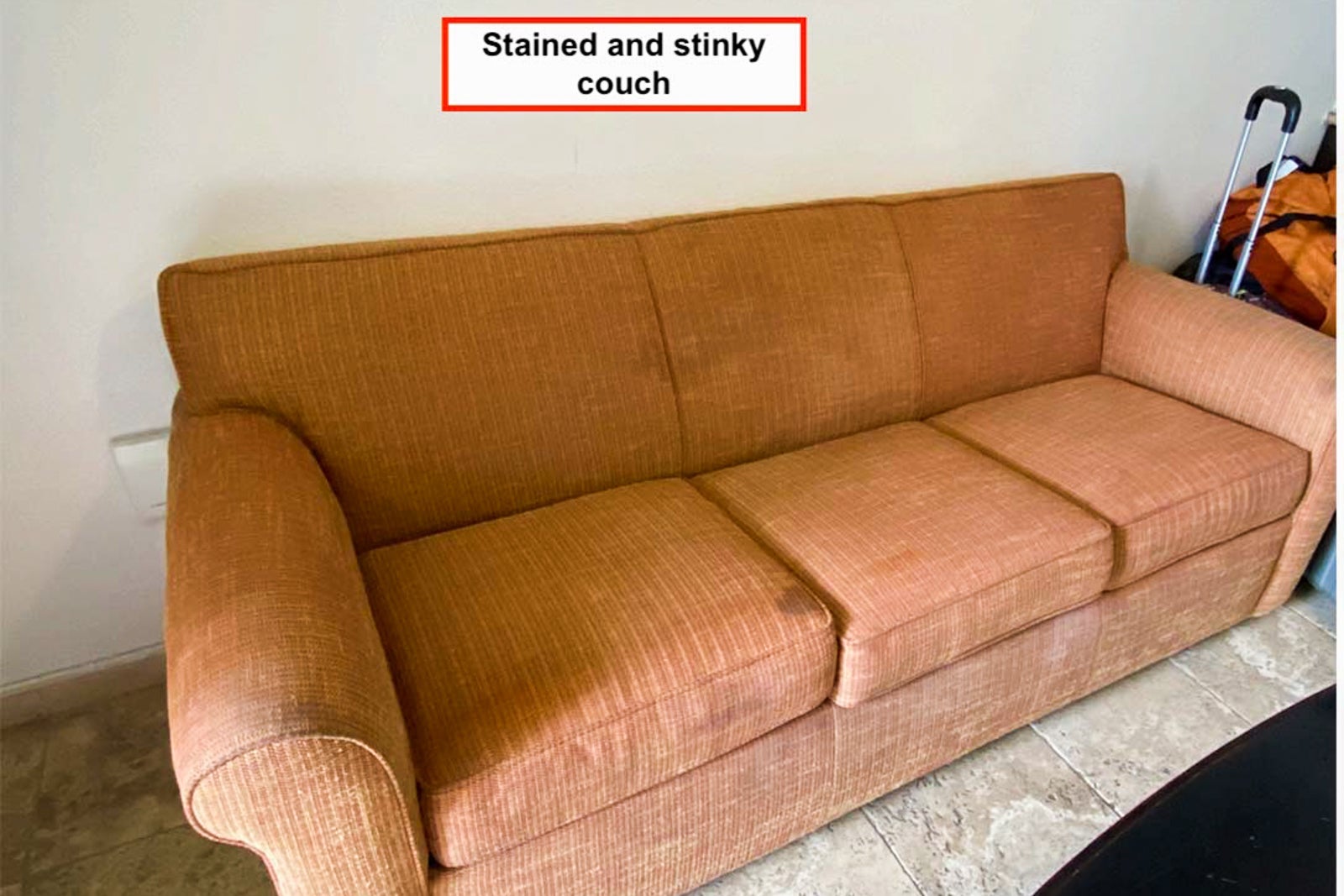 The family was traveling with children, so they expected to be able to use the fold-out couch, but the furniture was covered in mysterious dark stains.