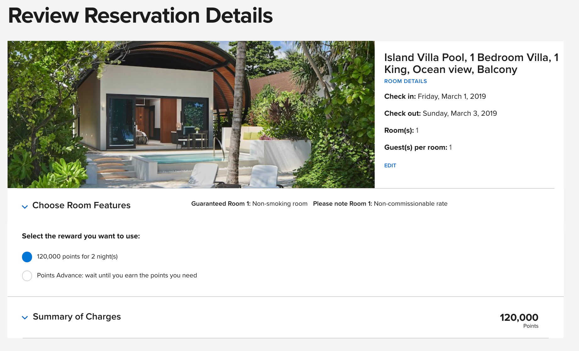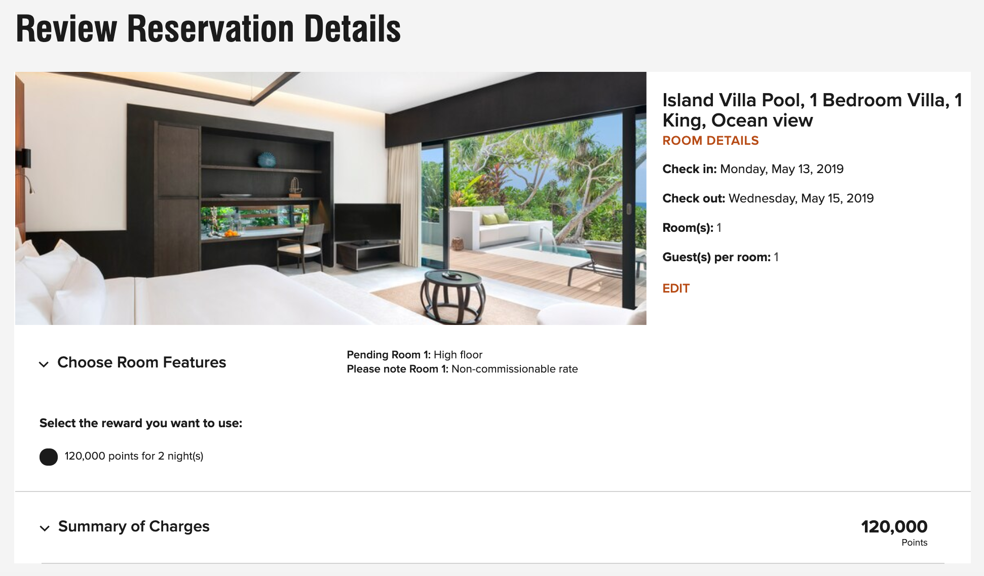 As an example, here's a screenshot from a sample two-night award booking at the Westin Maldives from late last year: