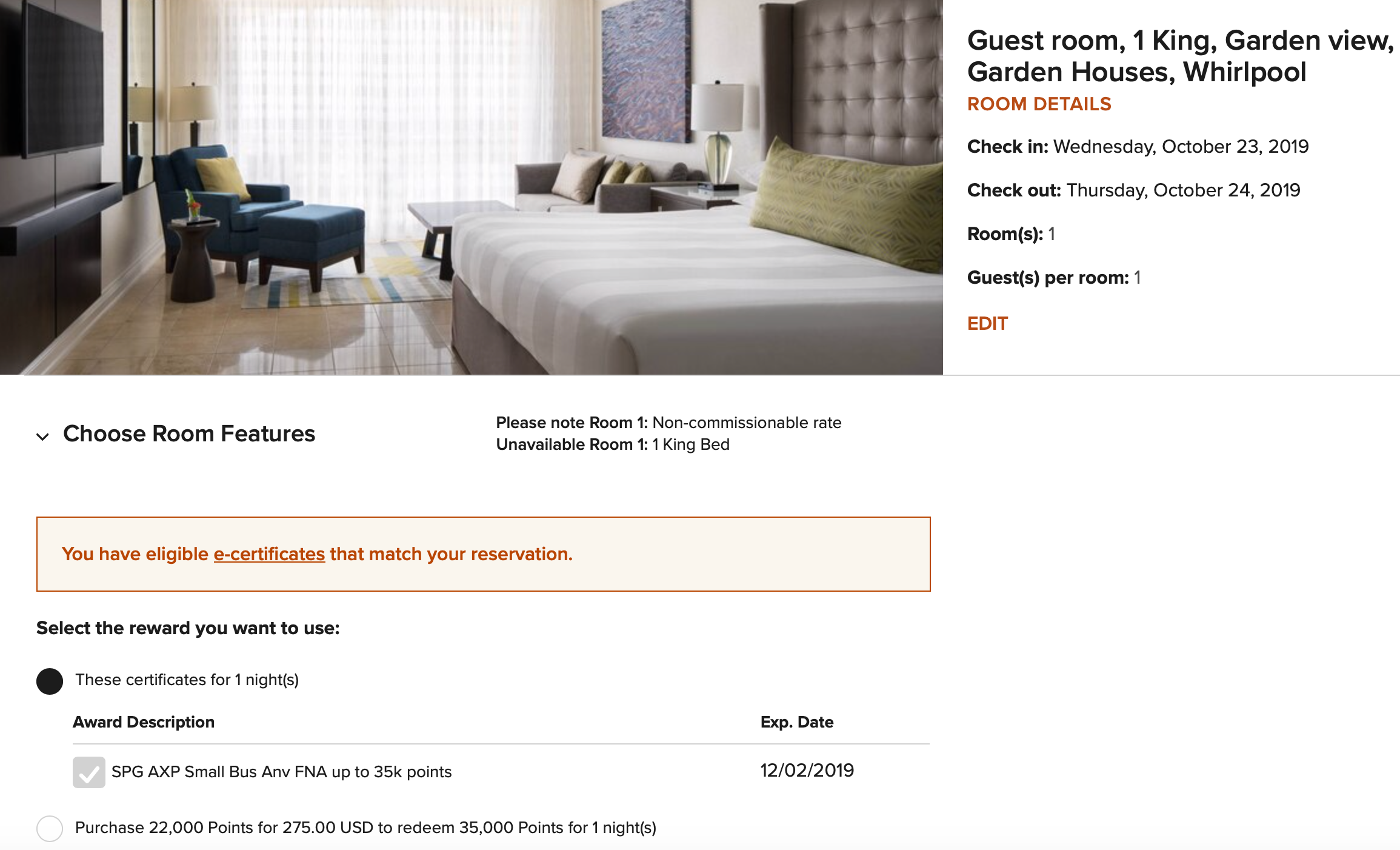 Note how the option to redeem your free night certificate doesn't appear, unlike when you try to book a Category 5 hotel, like at the St. Kitts Marriott Resort & the Royal Beach Casino: