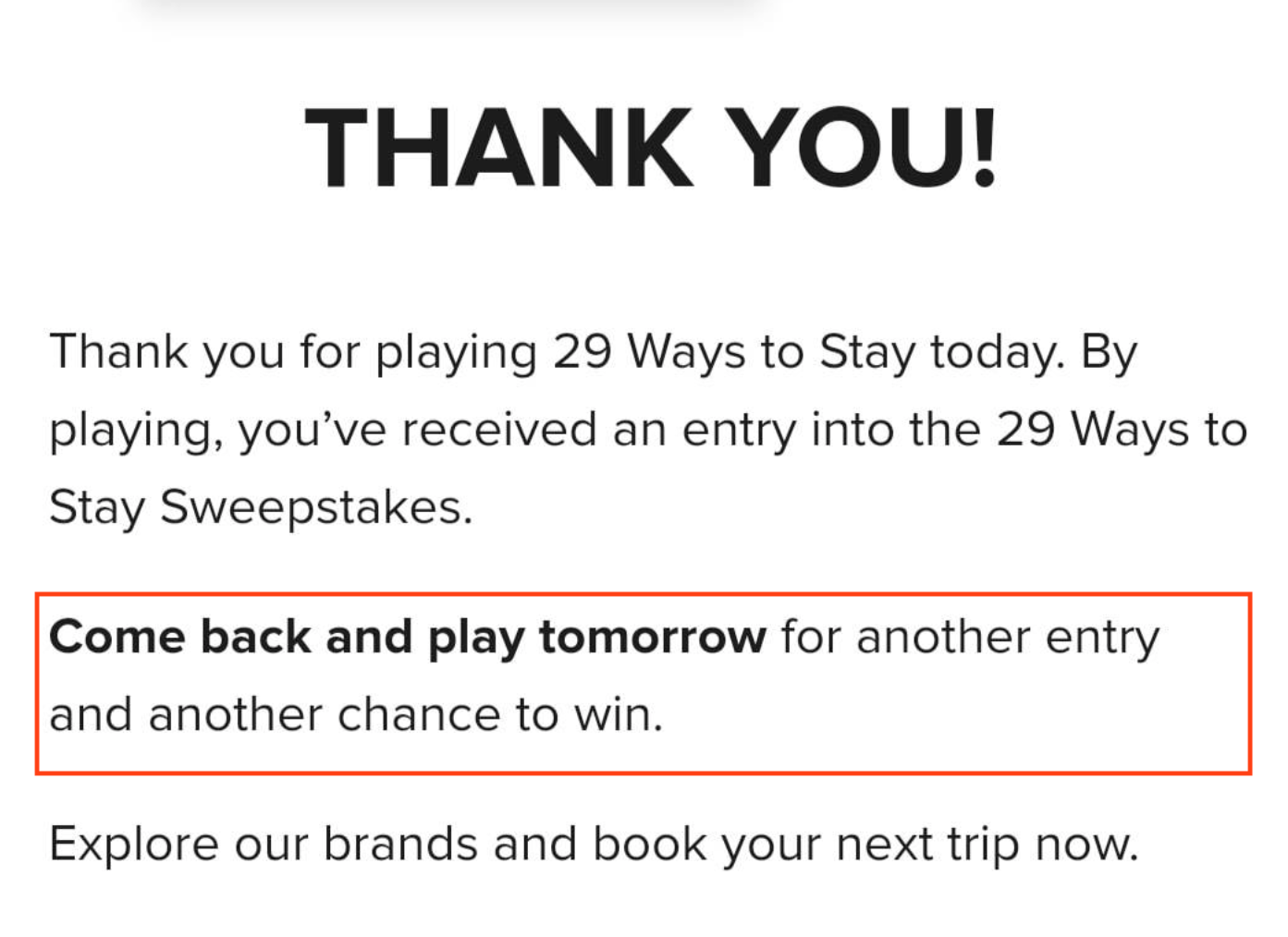 Despite what Marriott seems to imply, if 200+ data points are any indication, this is a one-and-done instant-win situation. That's really too bad: winning one 45-cent prize over 29 days of daily playing is a touch on the low side, and Marriott had a great opportunity to keep people returning to its site daily for almost a month.