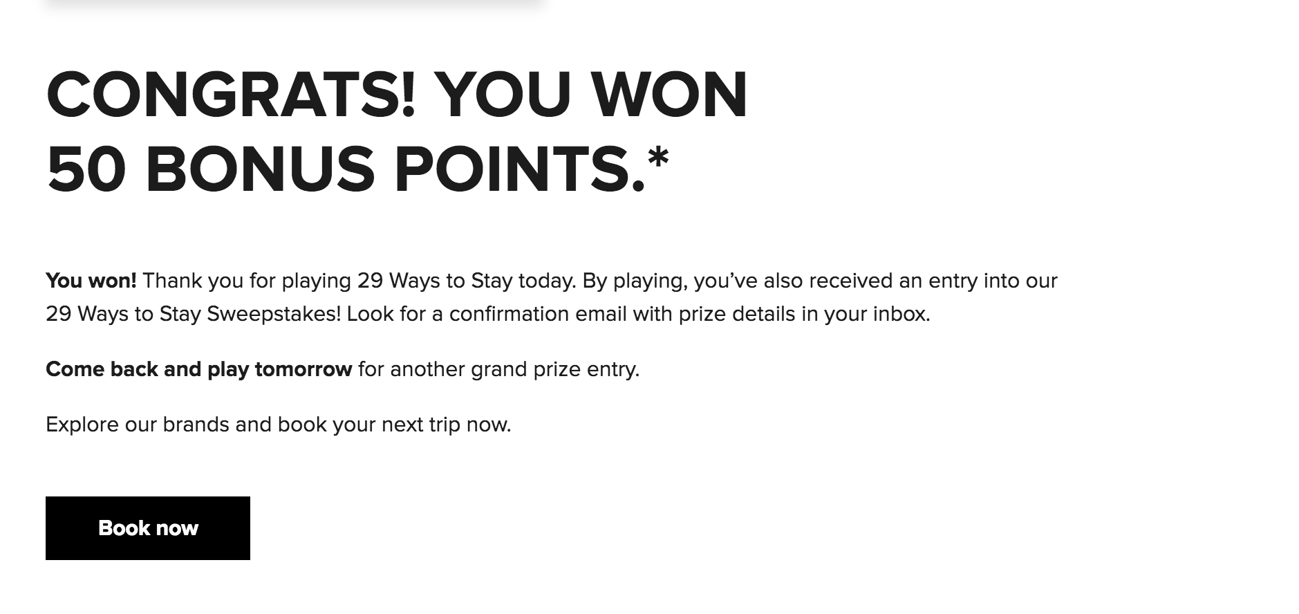 Based on tests within the TPG offices, and more than 200 responses to our question in the TPG Lounge, it is very likely that once you win anything at all — even just 50 Marriott Rewards points, worth 45 cents — the rest of your up to 28 days of playing won't result in any additional instant prizes. Instead, all you get on subsequent days of playing are extra entries into the grand prize drawing.