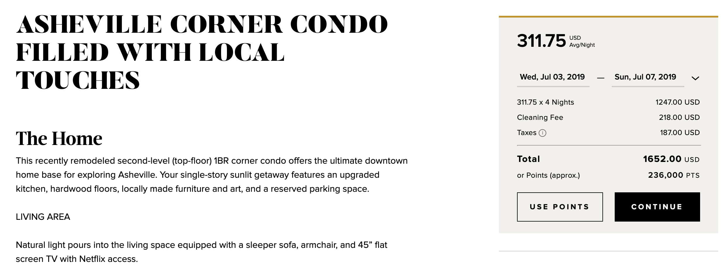 Of course, the big question is whether these properties are available using points, and the good news is that they are. It appears that they offer a consistent redemption value of 0.7 cents per point, like this example of a Fourth of July stay in Asheville, North Carolina: