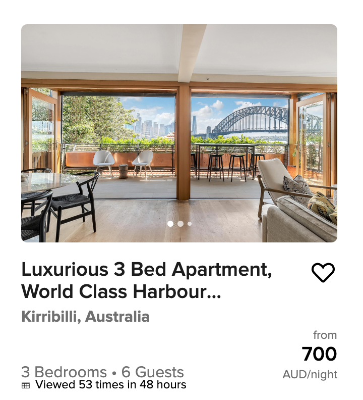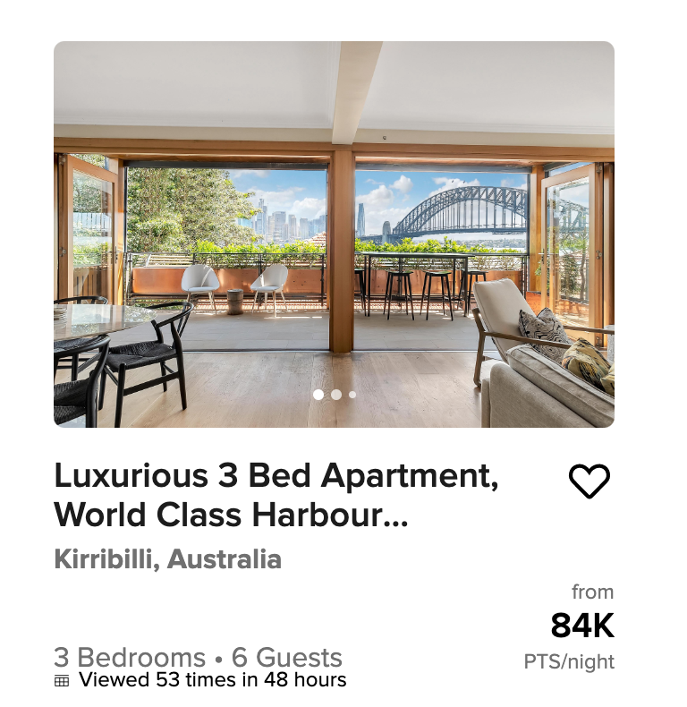 For a stunning view of the Sydney Harbour Bridge, you could rent an apartment with three bedrooms and 2 1/2 bathrooms in Kirribilli (pictured at the top of this article) starting at 700 Australian dollars ($480) or about 84,000 points per night, as shown on the search page.
