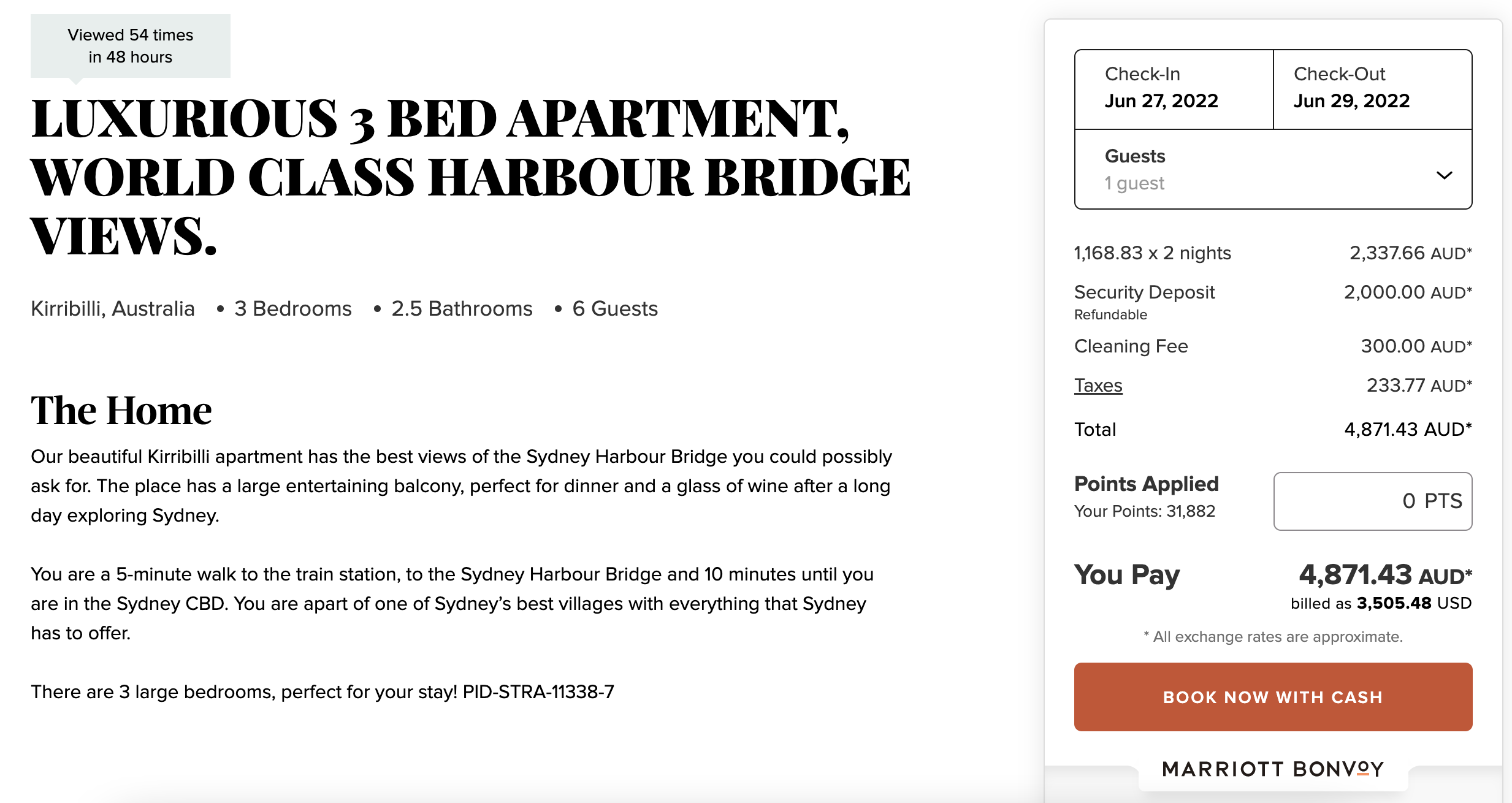 Doing my due diligence, I clicked into a less expensive apartment offering "World Class 360° Sydney Harbour Bridge & Opera House Views." This one was initially shown as AU$232 (about $150) or 28,000 points per night.