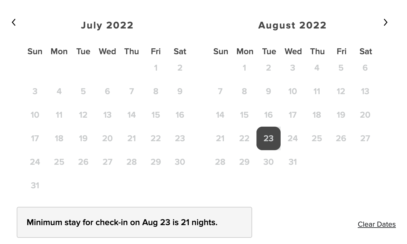 But again, it was a flustering experience attempting to book this property as there was only one available booking option for all of 2022: Aug. 12, with a five-night minimum.