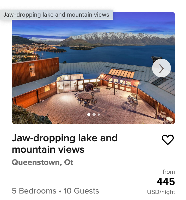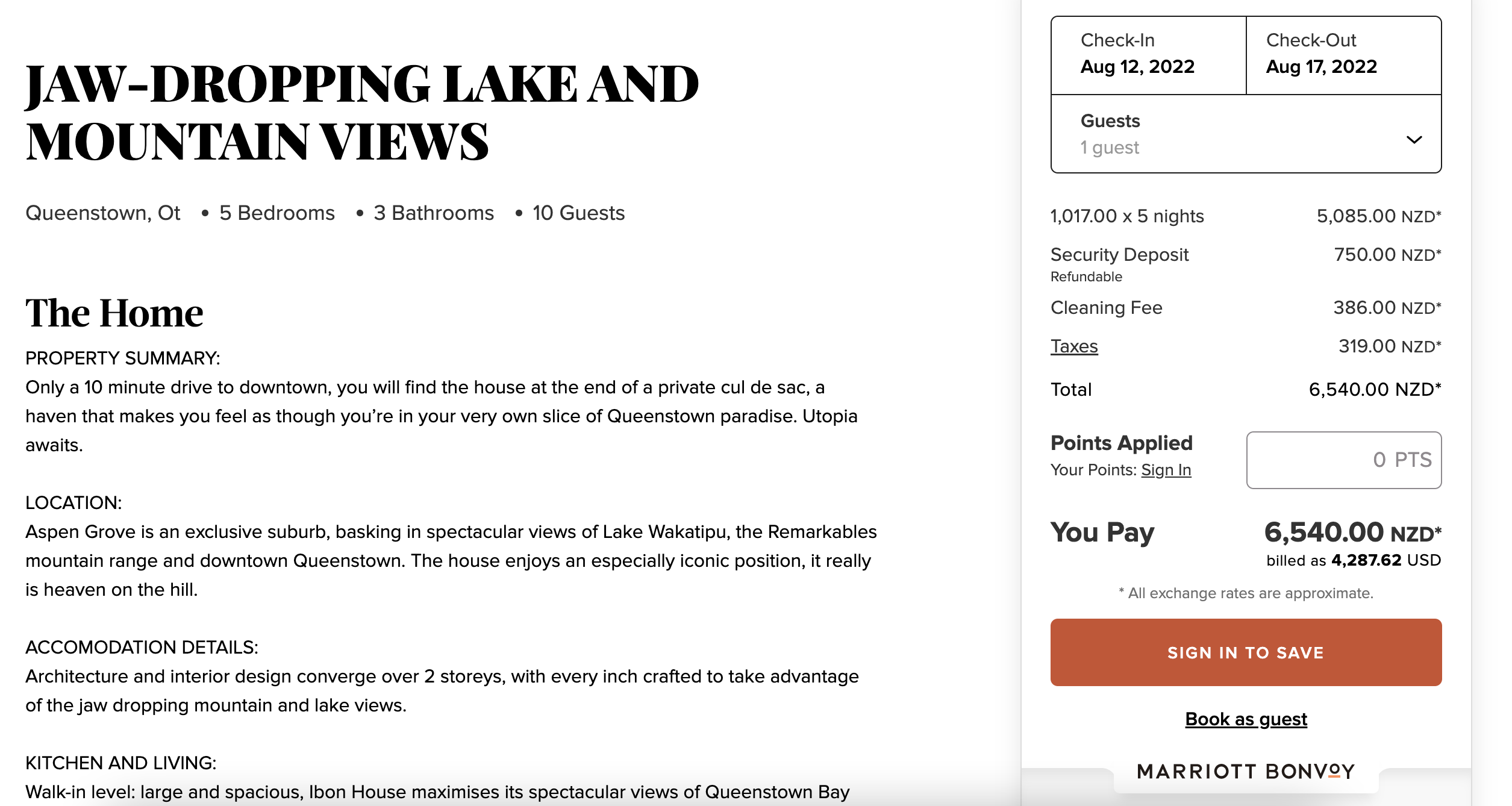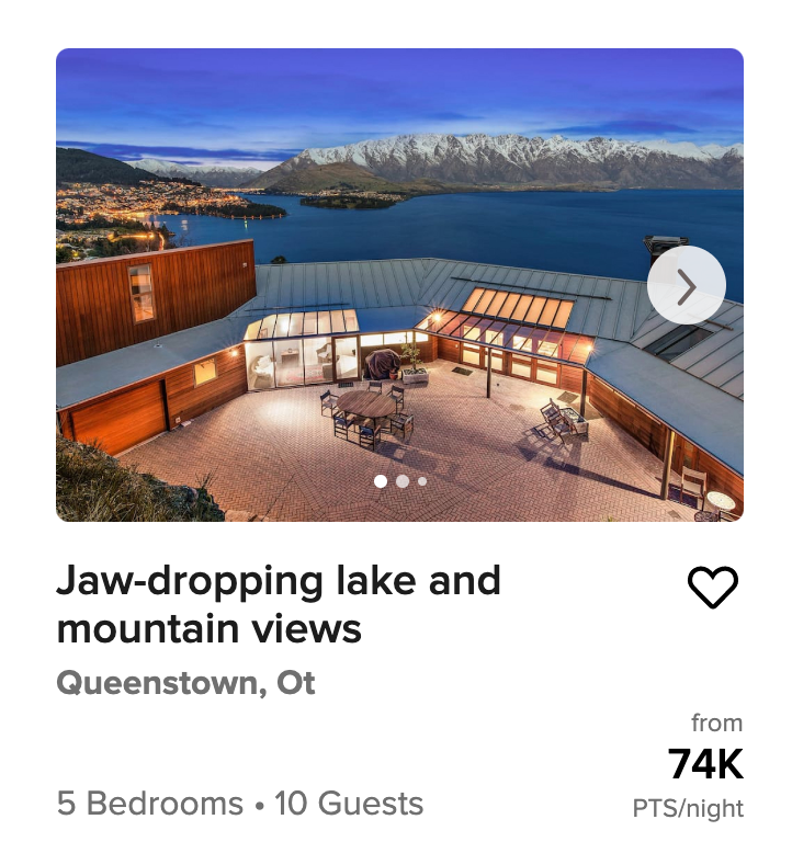 In Queenstown, a property called "Jaw-dropping lake and mountain views" initially appears in the search box for $445 per night (the search in New Zealand was listed in U.S. dollars versus the search in Australia that appeared as Australian dollars) or 74,000 points per night. Not a bad deal for a five-bedroom, three-bathroom house.