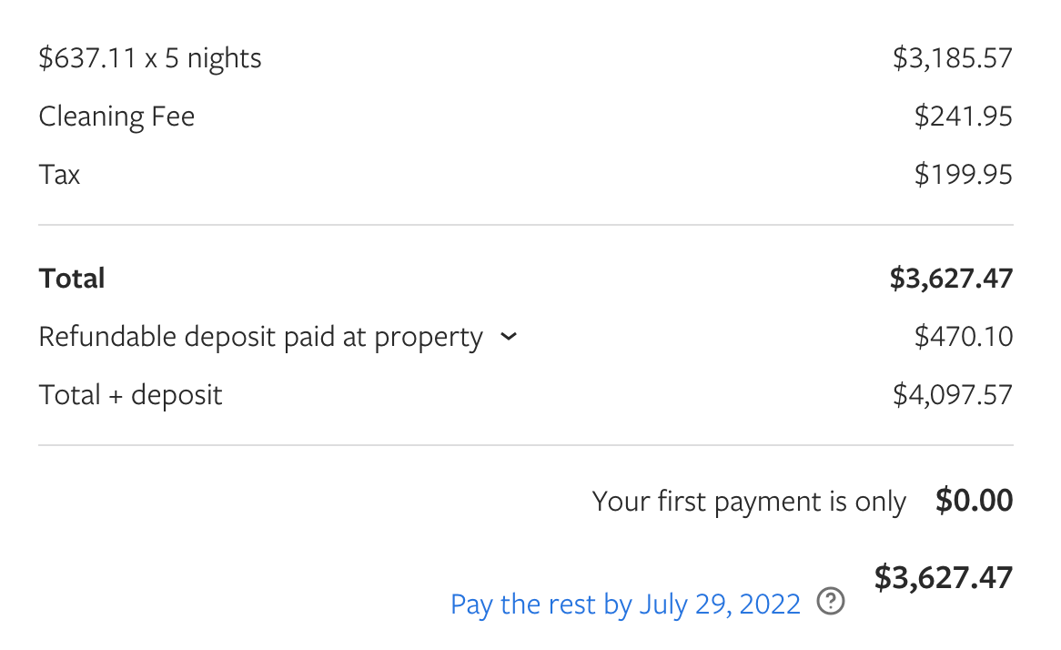 These prices aren't too far from what the property is being listed for on Vrbo, where everything is shown in U.S. dollars. There, the nightly rate was $637.11 with a $241.95 cleaning fee, $199.95 in taxes and a $470.10 refundable deposit. The total on Vrbo came out to $4,097.57, as shown below.