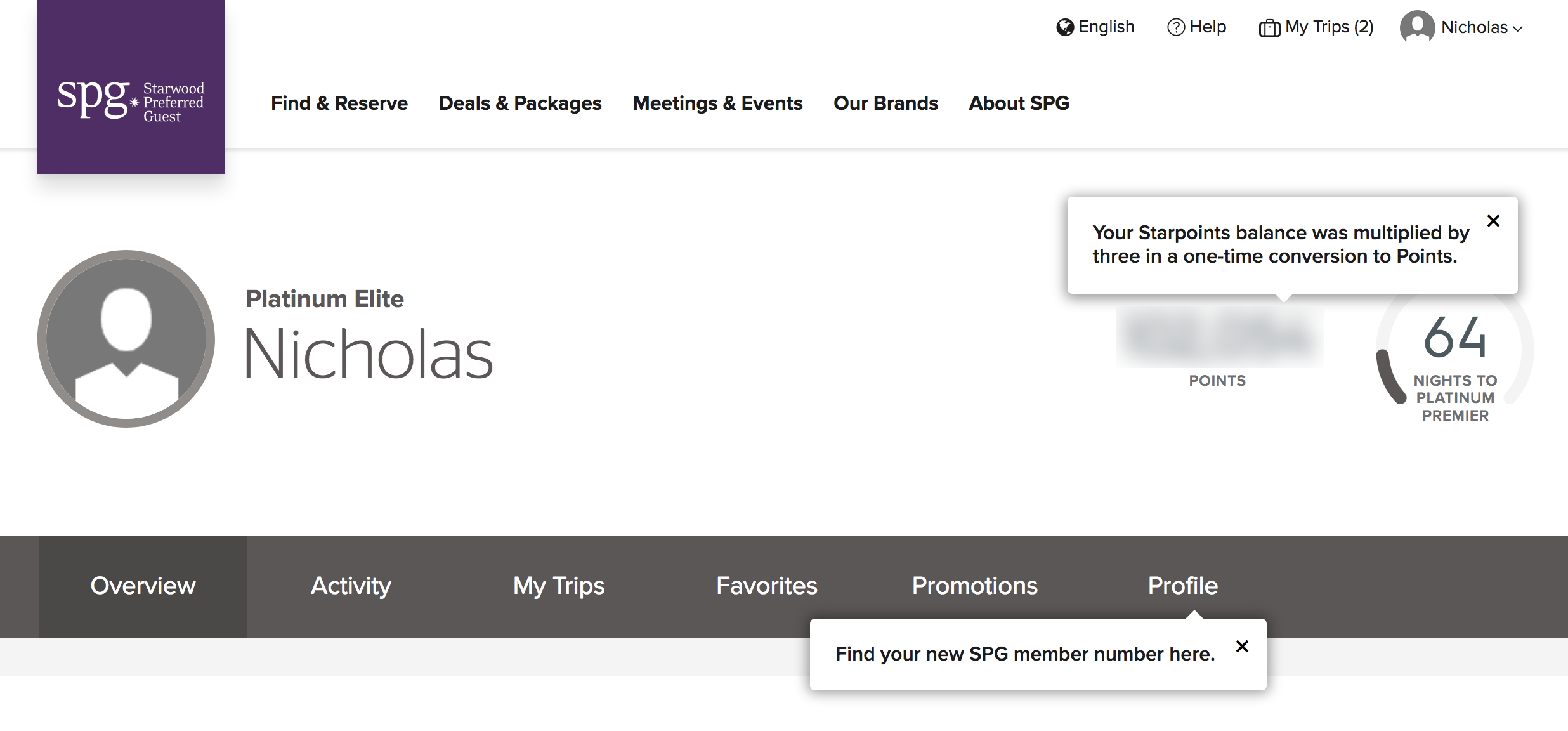 You may even see pop-up boxes reminding you that your Starpoints have been multiplied by three, and the site may also direct you to visit the profile section of your account to see your new Marriott number. Note that this is different from your old separate Marriott number, and your old Starwood number should be listed underneath.