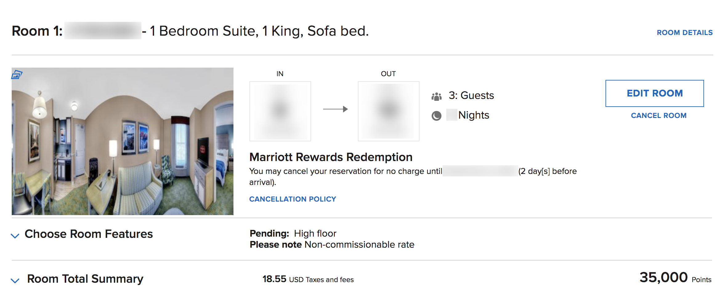 One bit of good news involves pre-integration Marriott awards booked with the program's "points advance" feature. It appears that reservations booked without enough points attached are being automatically updated to the lower point values. For example, a reservation for next month at the Residence Inn Portsmouth Downtown/Waterfront was booked in July at 40,000 points per night (plus $224.65 by using Marriott's Cash + Points option to use points for the more expensive night). As of today, it's showing the now reduced price of 35,000 points per night: