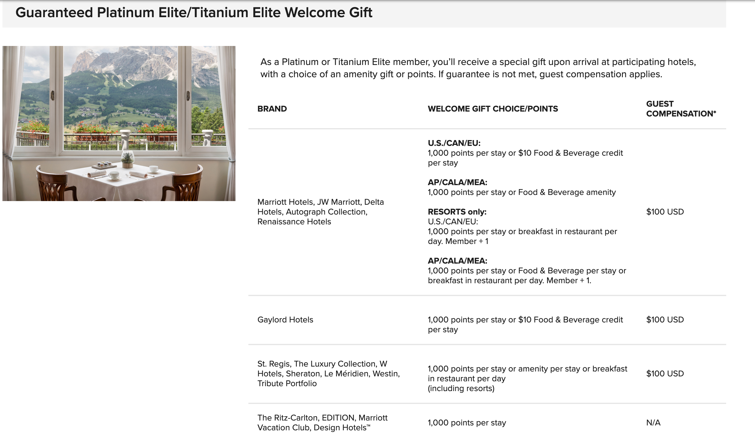 Marriott publishes an elite benefits guarantee, which clearly details the major benefits that come with different tiers of elite status, and more importantly, what compensation you're entitled to if the hotel fails to deliver on published benefits. If you're a Platinum, Titanium or Ambassador elite, you're entitled to a choice of welcome gift at most properties. The exact options vary by brand, but will usually include bonus points, free breakfast, a food and drink credit, or some local amenity.