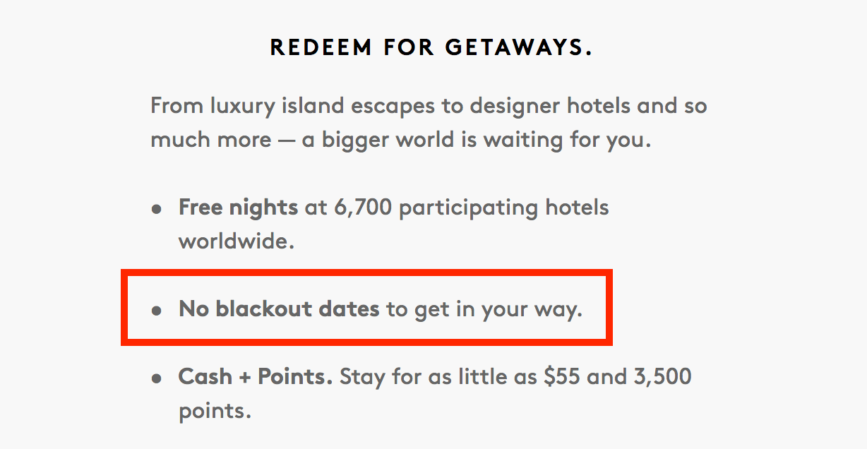 The Company has a "No Blackout Dates" policy, which means that, subject to the limitations and exclusions below, Participating Properties have standard rooms available every day for Award Redemptions. These limitations and exclusions are: