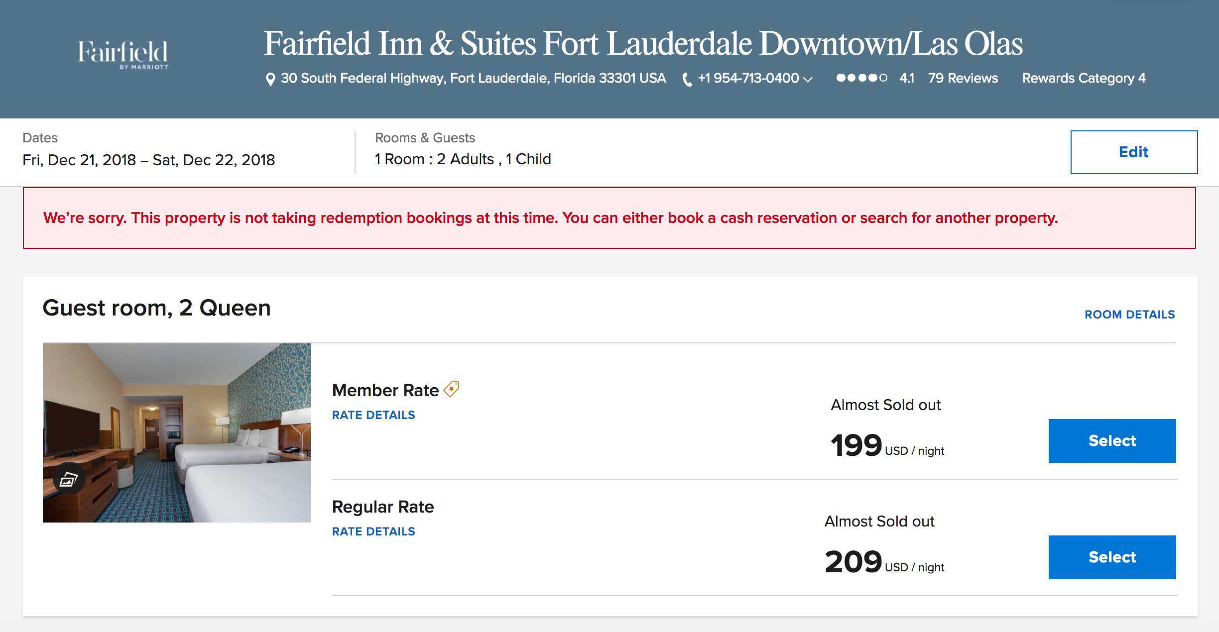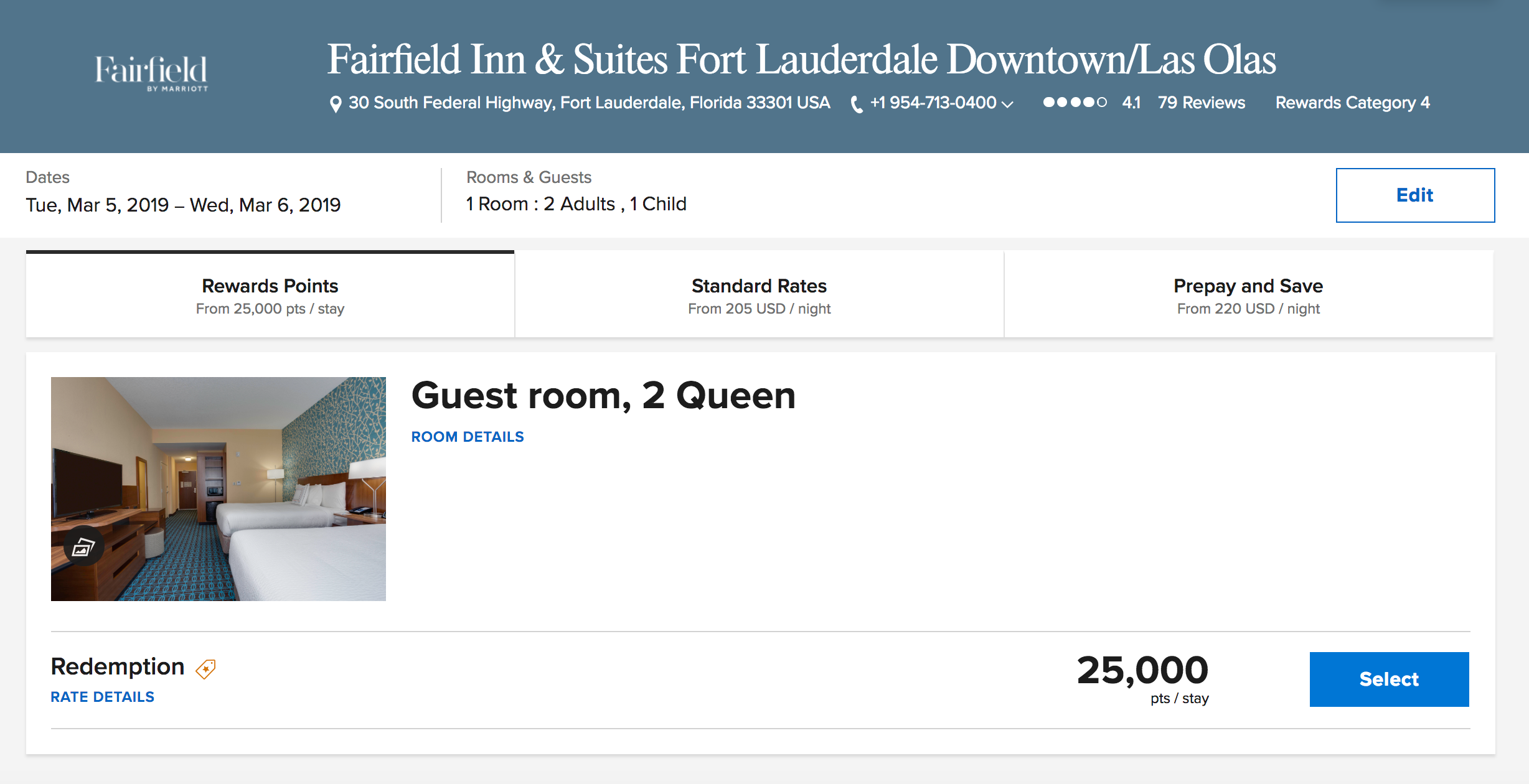 Over the weekend, I was looking for a room near downtown Fort Lauderdale to take my wife and daughter to the national tour of Hamilton this coming weekend. During my hotel search, I noticed that the Fairfield Inn & Suites Fort Lauderdale Downtown/Las Olas had a standard guest room (two queens) available for sale with cash, but not when using points.