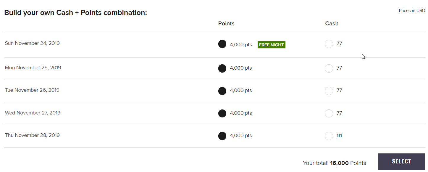 Turns out, I've currently got a few of these rates nearby. That's right, off-peak Category 1 PointSavers hotels. Booking in increments of five means I'll get every fifth night free, and I just may be able to pull it off for 80,000 points.