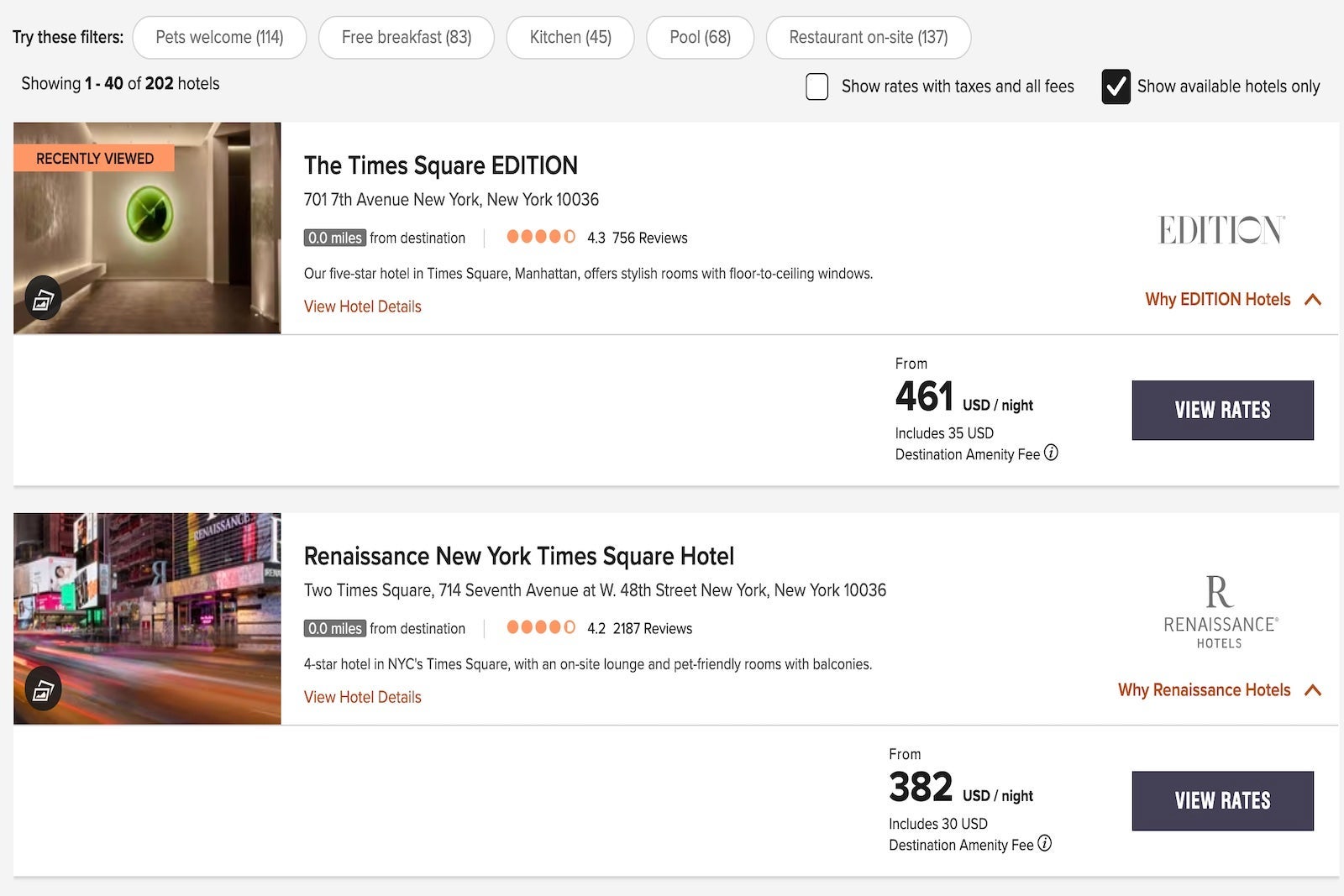 A sample booking for New York City Marriott hotels this week shows the Times Square Edition, Renaissance New York Times Square Hotel, the New York Marriott Marquis and other Marriott-affiliated hotels in the area included the "destination amenity fee" in the nightly rate and noted such a fee was part of the overall charge.