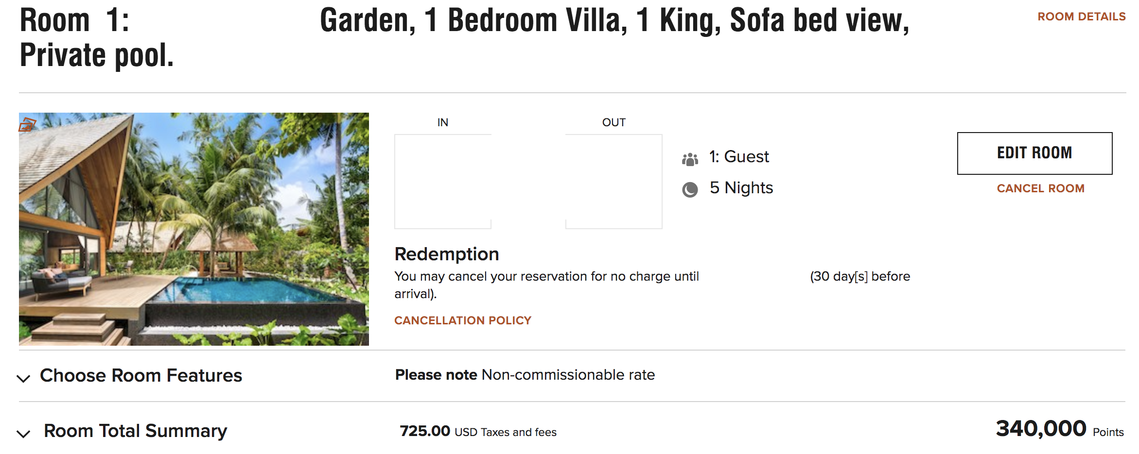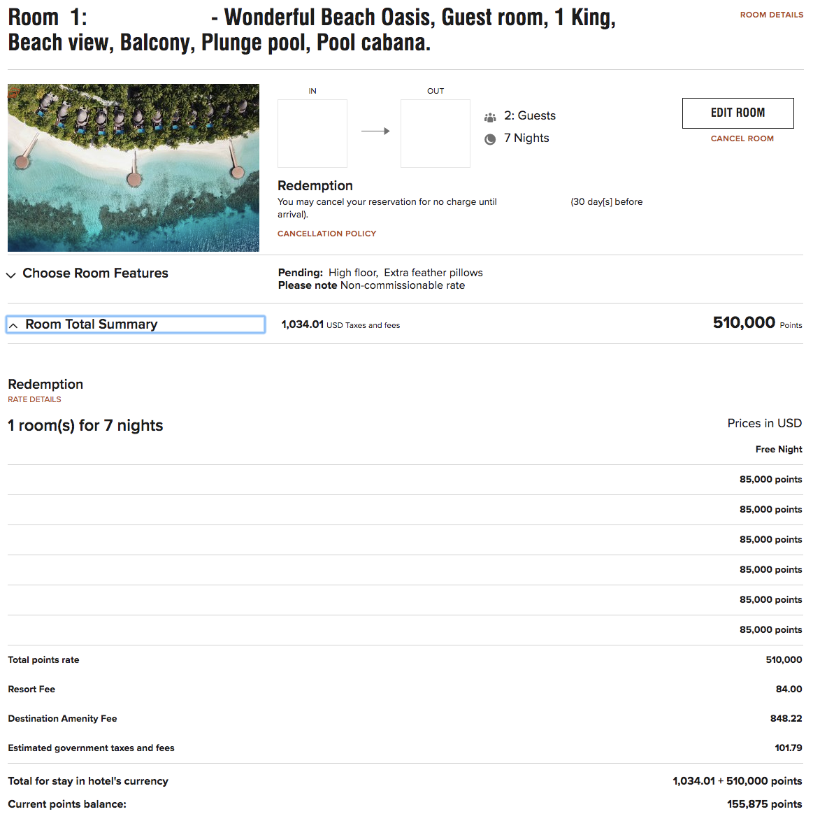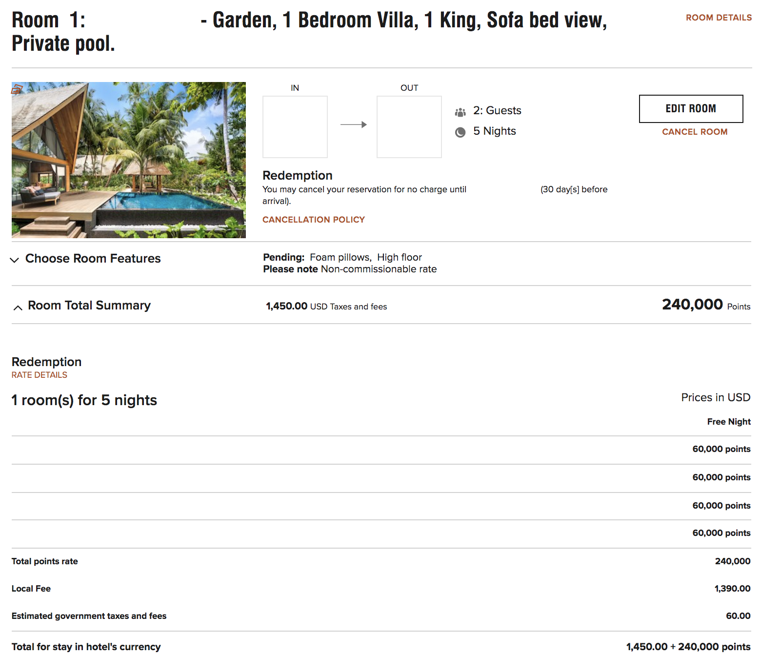 Meanwhile, fellow admirer of the Maldives (and TPG writer) Katherine Fan secured a Points Advance reservation at the St. Regis Maldives prior to the full implementation of Category 8 pricing. However, she applied the full balance of points at the old rate on March 4, 2019 — 240,000 points for a five-night stay, tabulated as 60,000 points per night with a fifth night free. Her reservation, which is now settled up, still shows the old rate.
