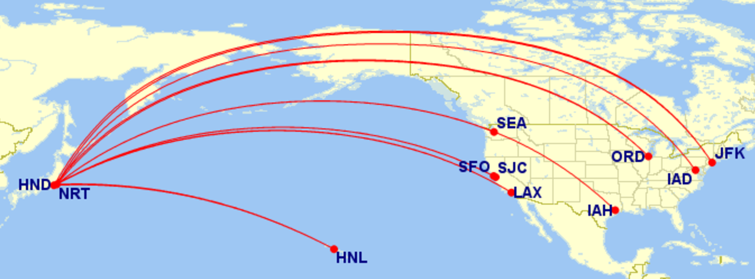 - Los Angeles (LAX) to Tokyo Narita (NRT) — 2x daily using a Boeing 777