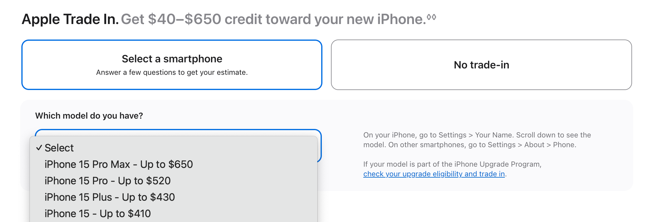 If you have any spare devices lying around, Apple will offer you credit (or a gift card) toward the purchase of a new phone. Credits range from $40 for the iPhone 7 Plus (2016) to as much as $650 if you hand over last year's iPhone 15 Pro Max.