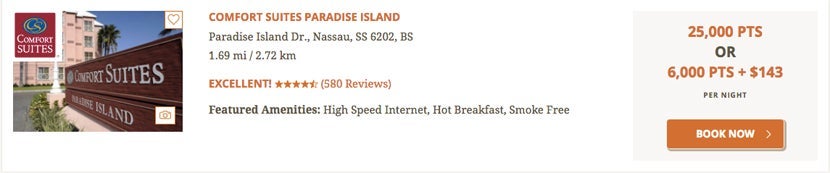 On this side of the Atlantic, you can stay at the Comfort Suites Paradise Island in the Bahamas (including complimentary hot breakfast and full access to Atlantis next door) for 6,000 points plus $143, or about $188 using the Points Plus Cash option.