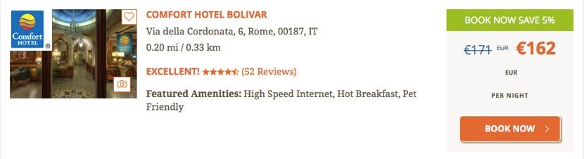 For example, on a random night this summer, the Comfort Hotel Bolivar, located in the heart of Rome, costs 162 euros, or about $178.