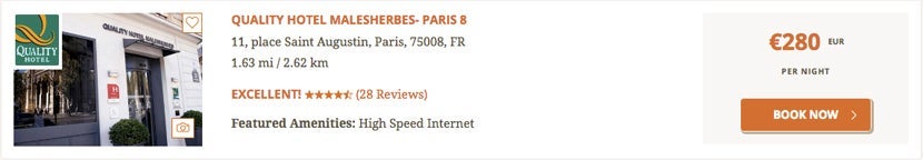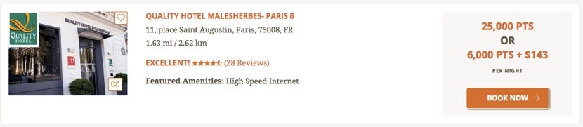 I also found a hotel in Paris's 8th arrondissement, Quality Hotel Malesherbes, where the cash price for a random night is 280 euros or about $308.