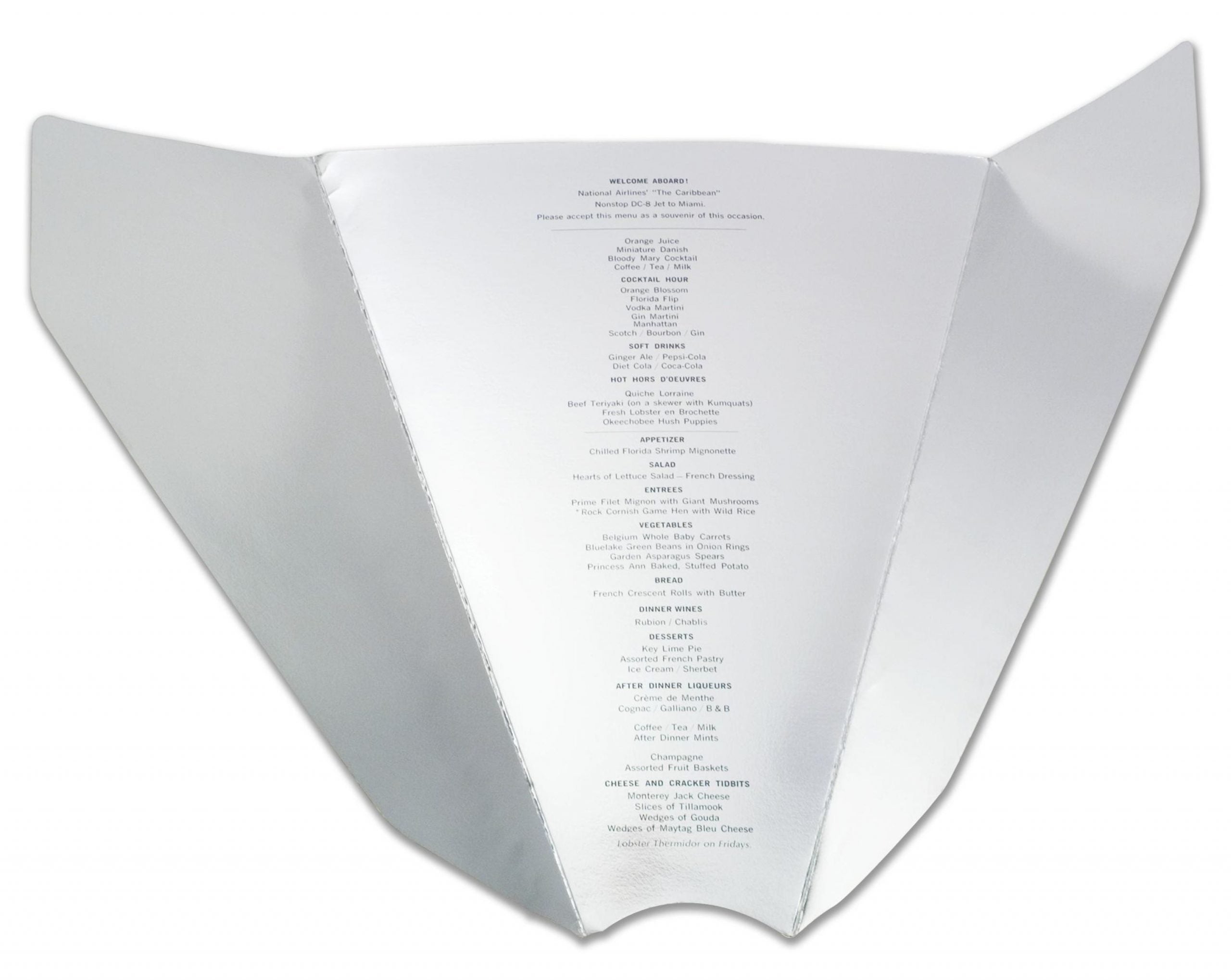 This airline, founded in 1934, operated flights between New York and Miami, Miami to the West Coast and, in 1970, Miami to London. The flight had a full meal service, including happy hour drinks, hot Hors d'oeuvres, an appetizer, a salad, a choice of two entrees and three desserts, along with a selection of wines and after-dinner drinks. Plus the menu could be used as a sun reflector.