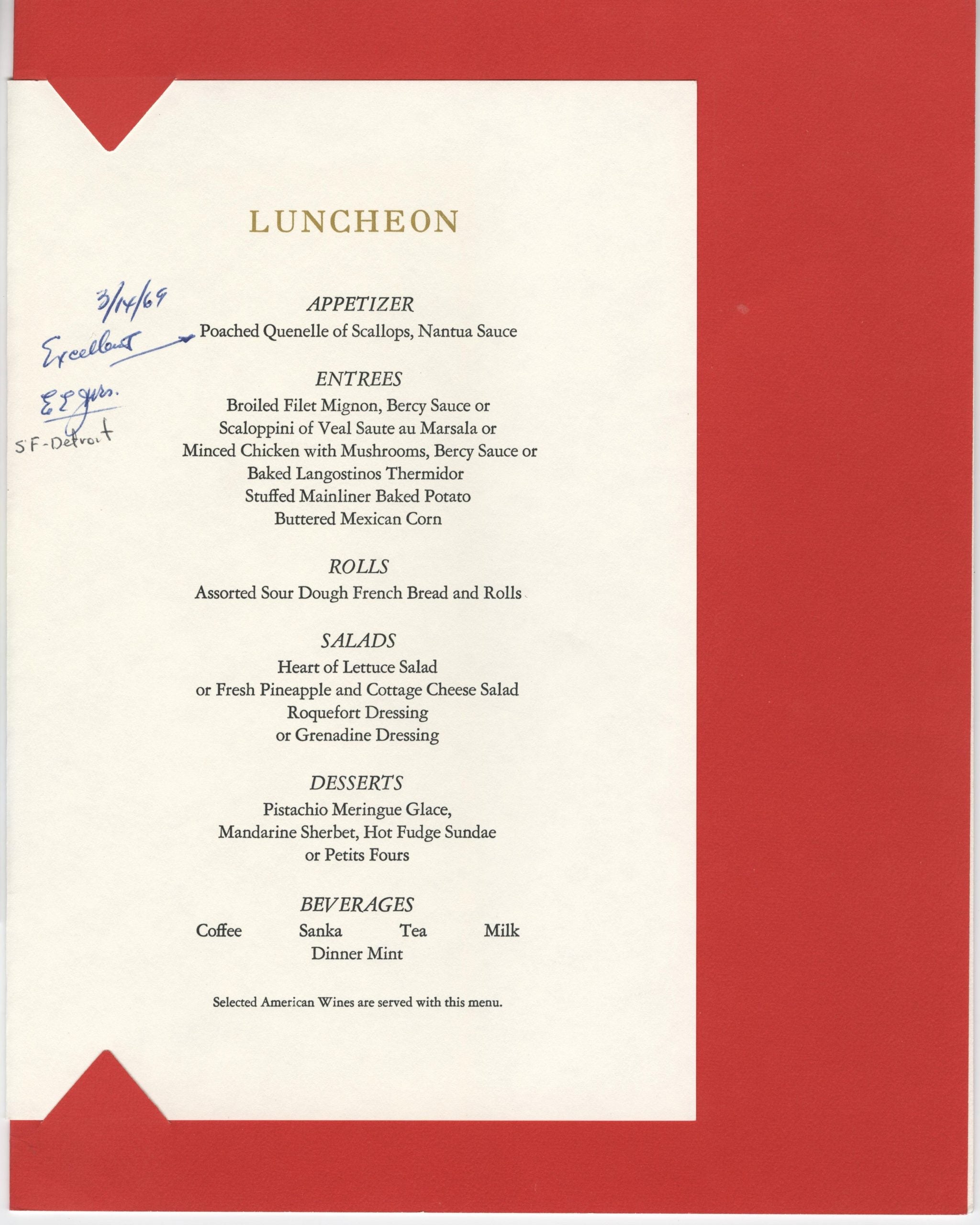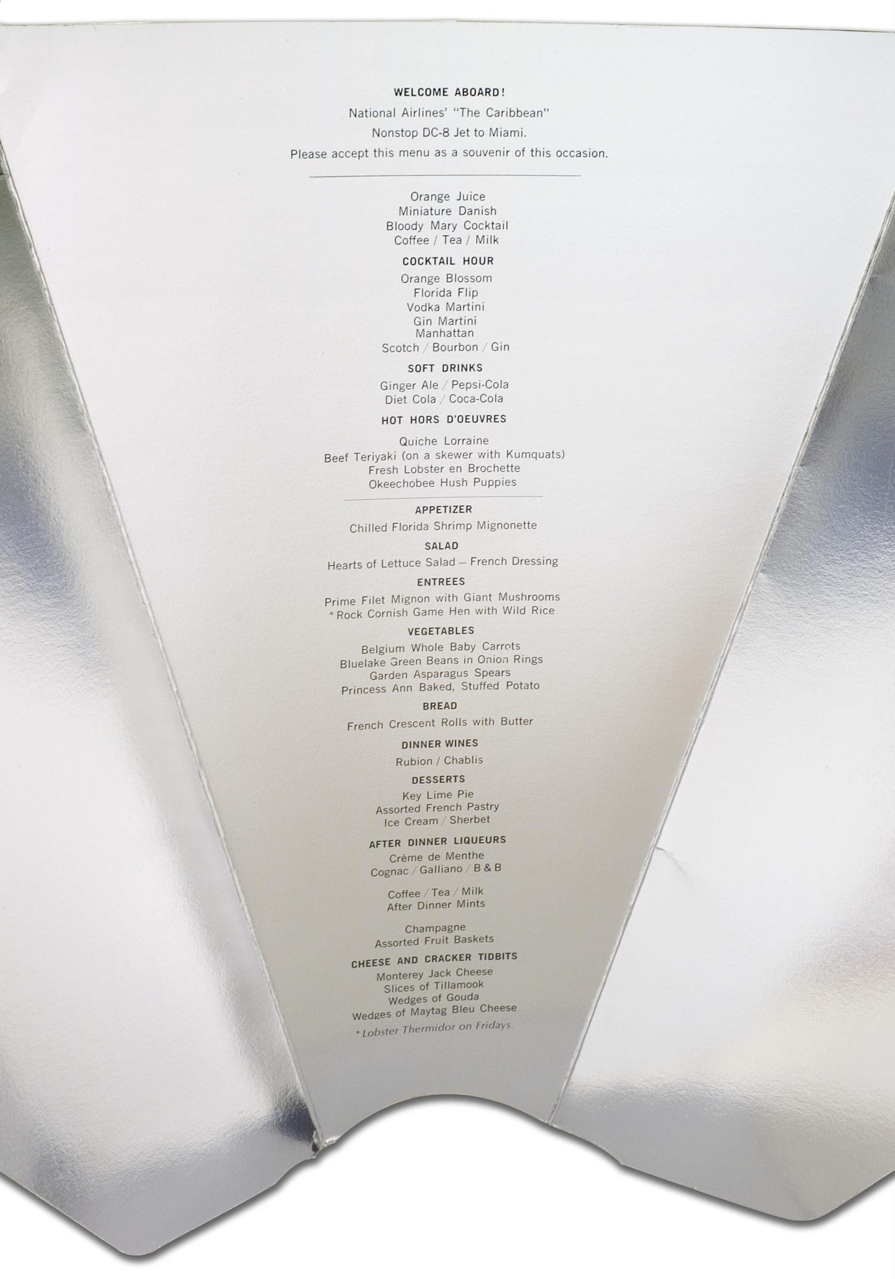 What makes the menu collection unique is Foster's hand-written comments on flight dates, airplane types and food and wine ratings and descriptions. "The menus preserve a glimpse of the golden age of air travel in which fine dining, fine wines, and thoughtful design created a passenger experience of mystique and allure," according to the Transportation Library. "Menus, flight attendant uniforms, silverware, timetables, and even airline terminals were components of airlines' visual identities through which they represented adventure, excitement, and an optimism about the future."