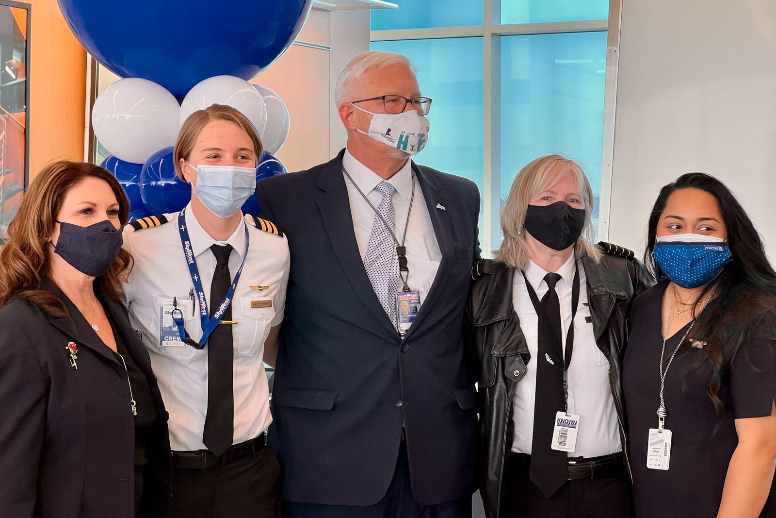 All-female crew of the first flight to land at the new concourse, along with Memphis airport CEO Scott Brockman (Photo by Zach Griff/The Points Guy)