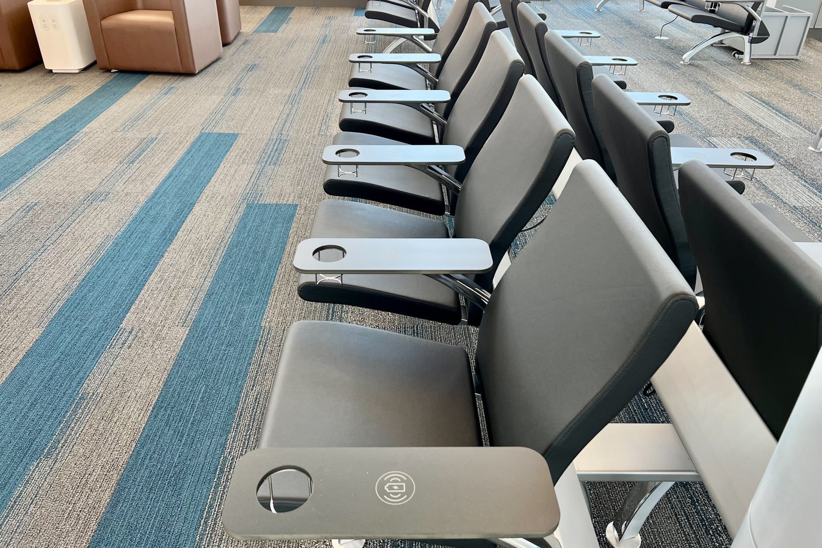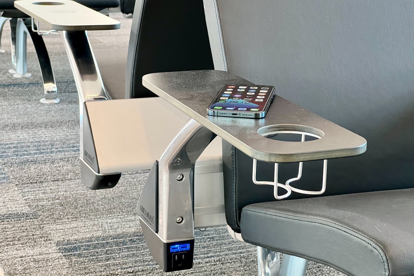 There are traditional gate-side seats, along with barstools, individual reclining pods and leather chairs. Each is outfitted with an AC outlet and two USB-A ports, as well as Qi-wireless charging mats to keep all your devices powered up.