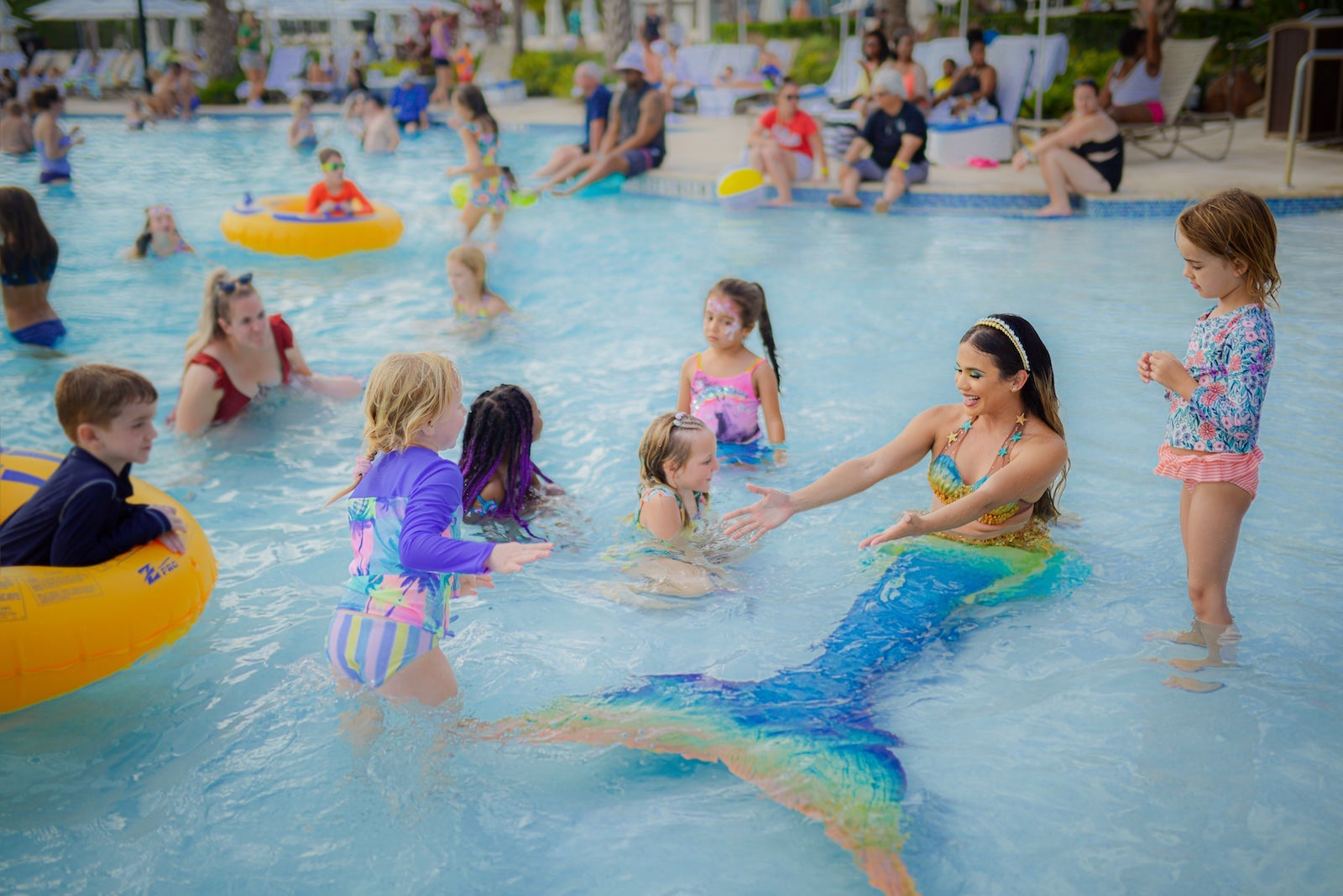 Less than 2 miles from Walt Disney World at the Orlando World Center Marriott, guests can meet "real" mermaids during Mermaids & Glow pool parties on select Saturday nights throughout 2023. Parties are at the Falls Pool and include meet-and-greet photo opportunities with the mermaids, pool games, arts and crafts, glow face painting, giveaways and more.