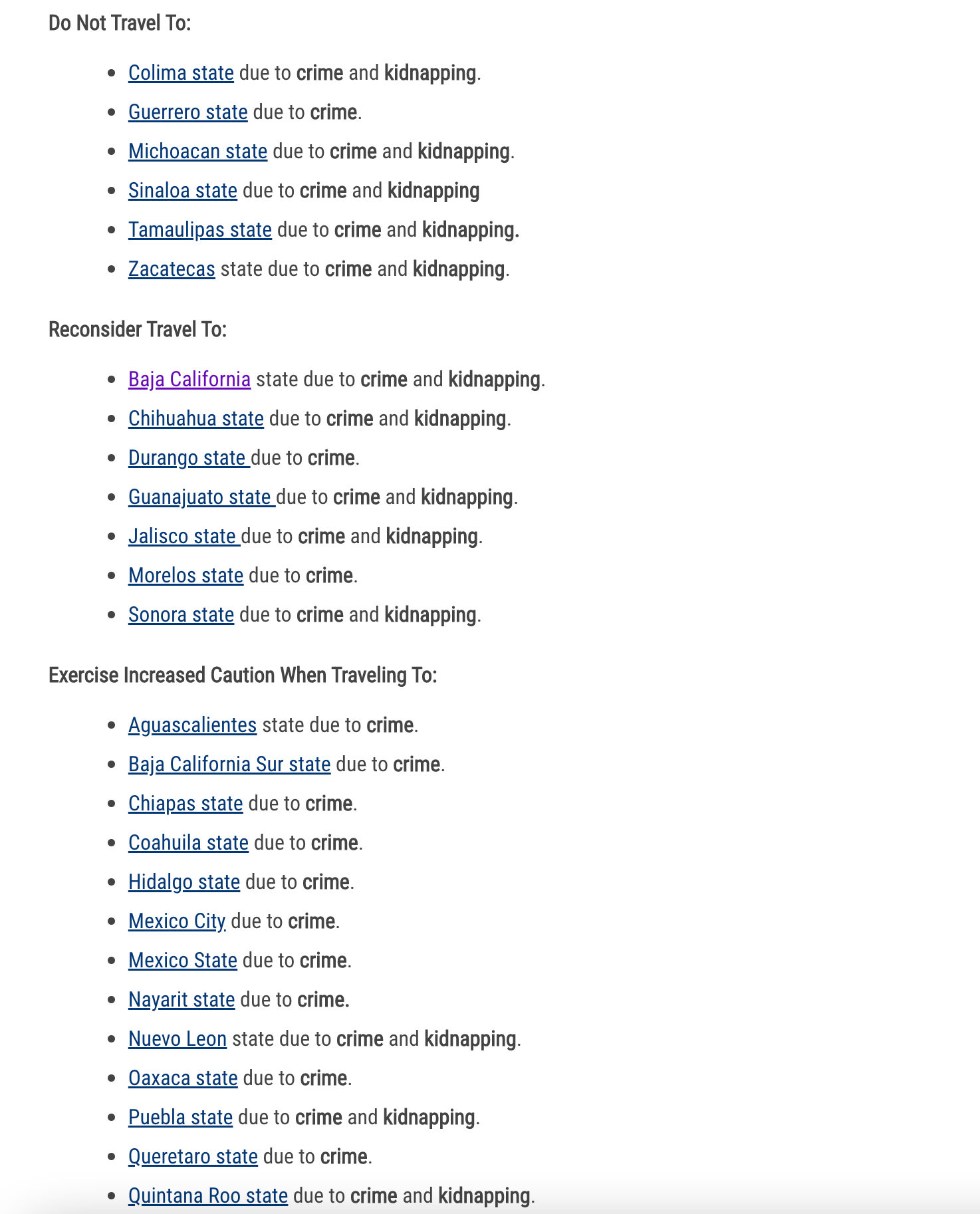 Six Mexican states have a "Do not travel" warning: Colima, Guerrero, Michoacan, Sinaloa, Tamaulipas and Zacatecas.