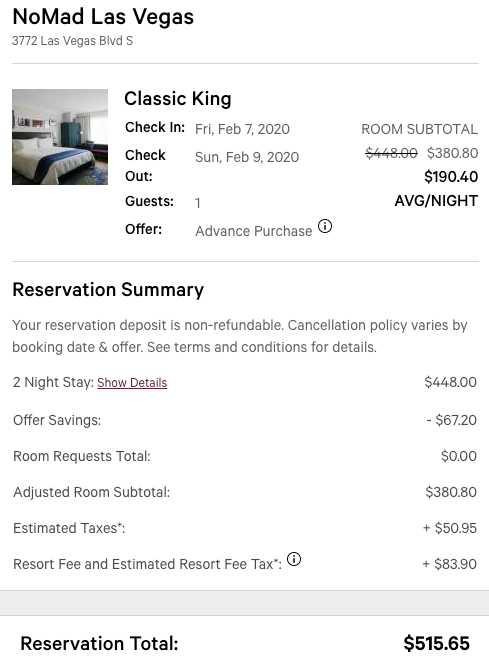To give you an idea of your earnings, if you book a weekend stay at the NoMad Las Vegas in the Classic King room, you could earn 3,800 Hyatt points. TPG values this at $65. Note you can only earn points on the base rate, not on the taxes and resort fees. Booking a stay can also help you earn elite status with Hyatt and M life, which is especially valuable for Vegas stays.