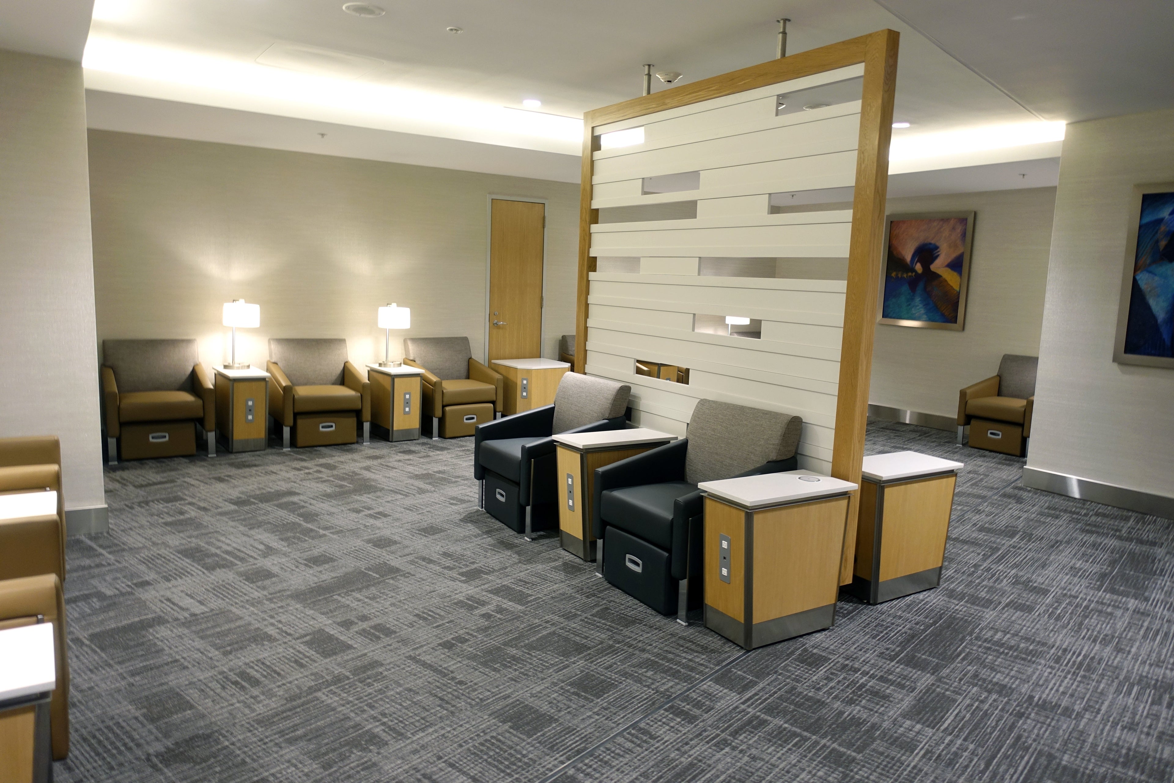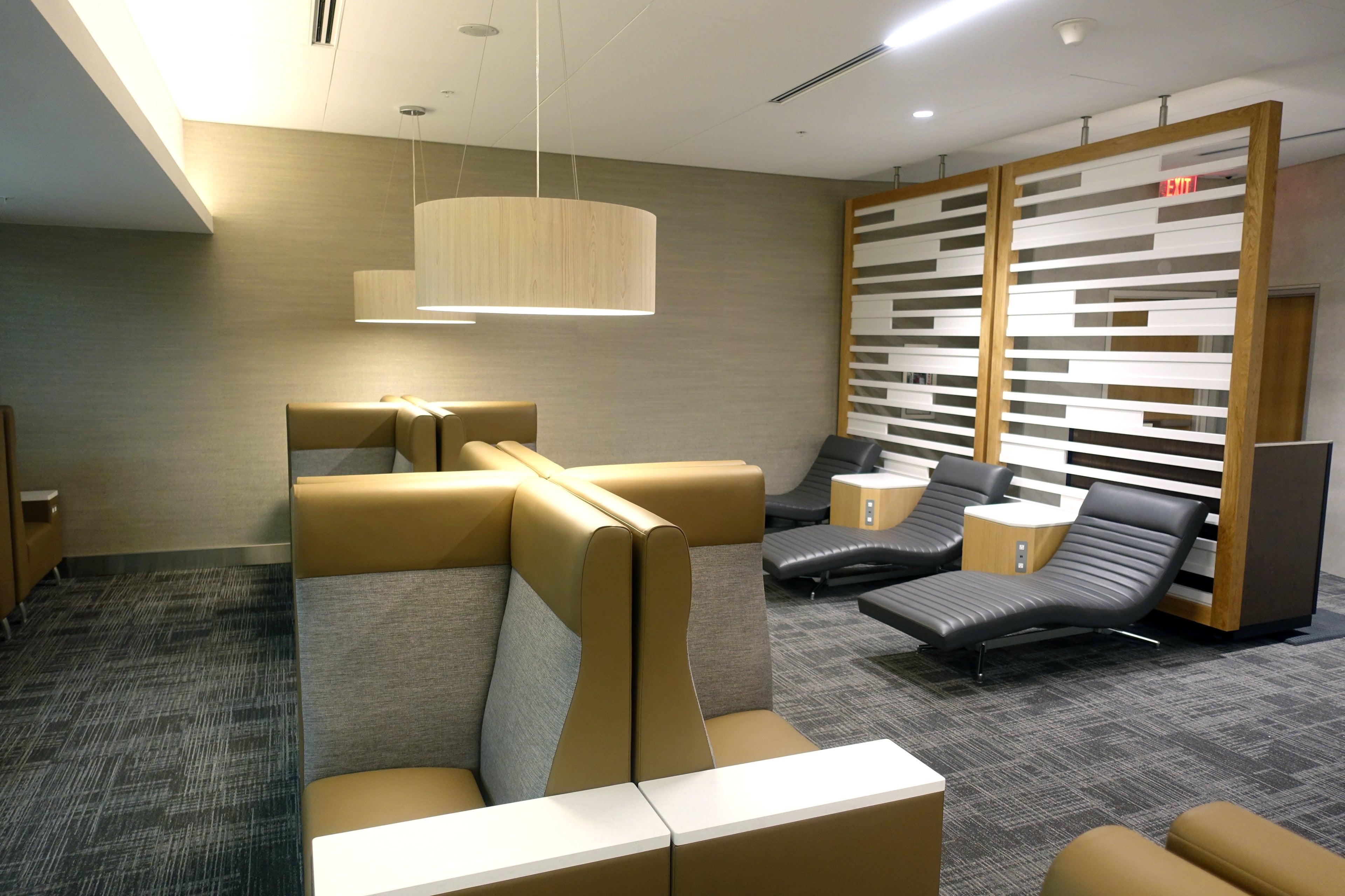 Not only does the lounge have the space, but it's outfitted with a variety of chairs that make it comfortable no matter what you're looking for. You can opt for the firm, straight, cushioned seats or the lounge chairs suitable for a quick snooze.