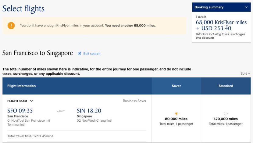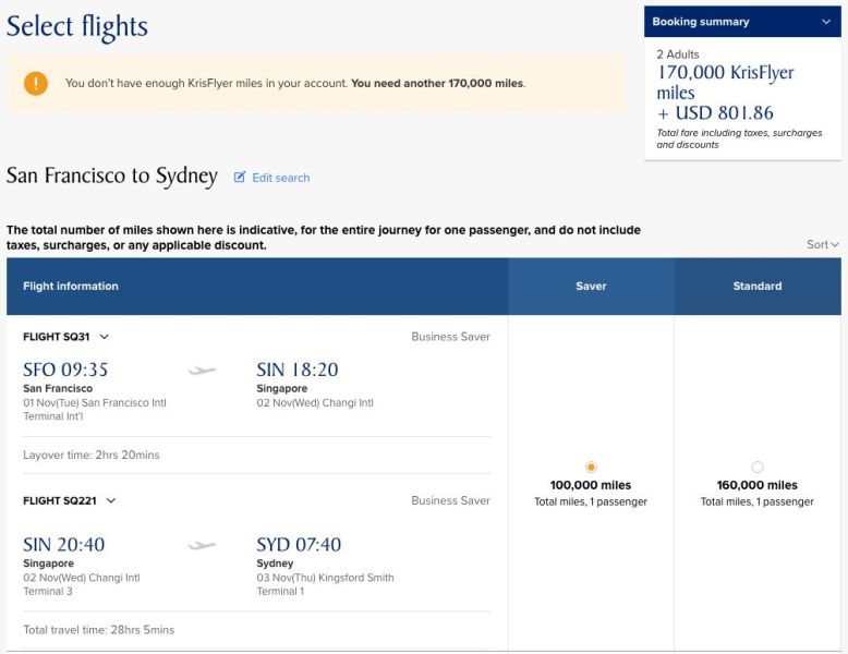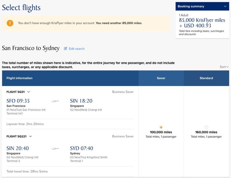 Of the above currencies, Citi ThankYou Rewards points are worth the least, at 1.6 cents each (based on TPG's monthly valuations), so that should be your first pick for a transfer. Once you have the points in your KrisFlyer account, you can book these flights. Let's take a look at award availability.