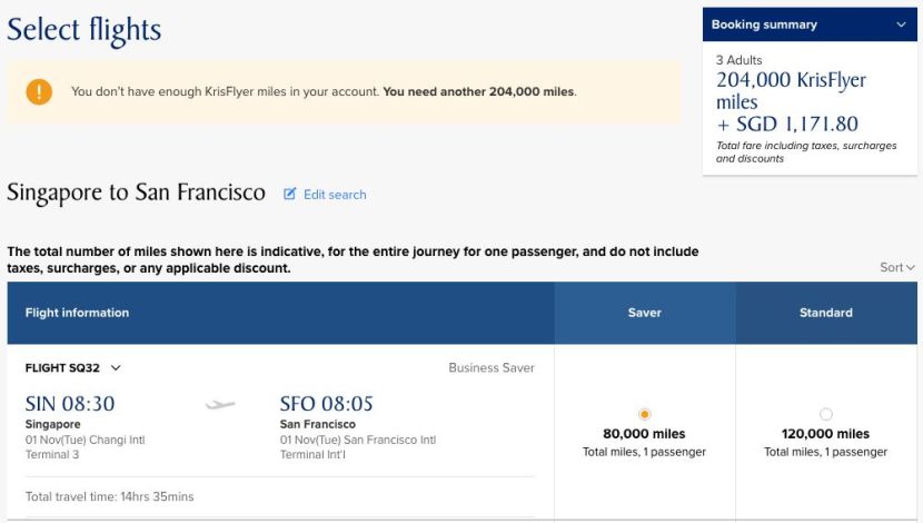 You can also find a fair number of award seats on the return flight from Singapore — here's an award for 3 people on November 1, priced at 204,000 miles plus $871: