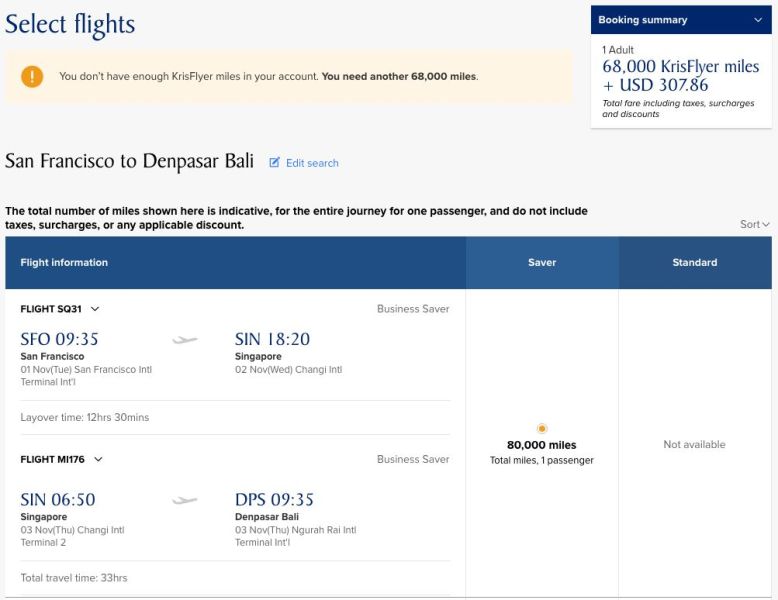You can also book a flight beyond Singapore throughout Southeast Asia for the same number of miles and only a bit more cash, such as this connecting option to Bali: