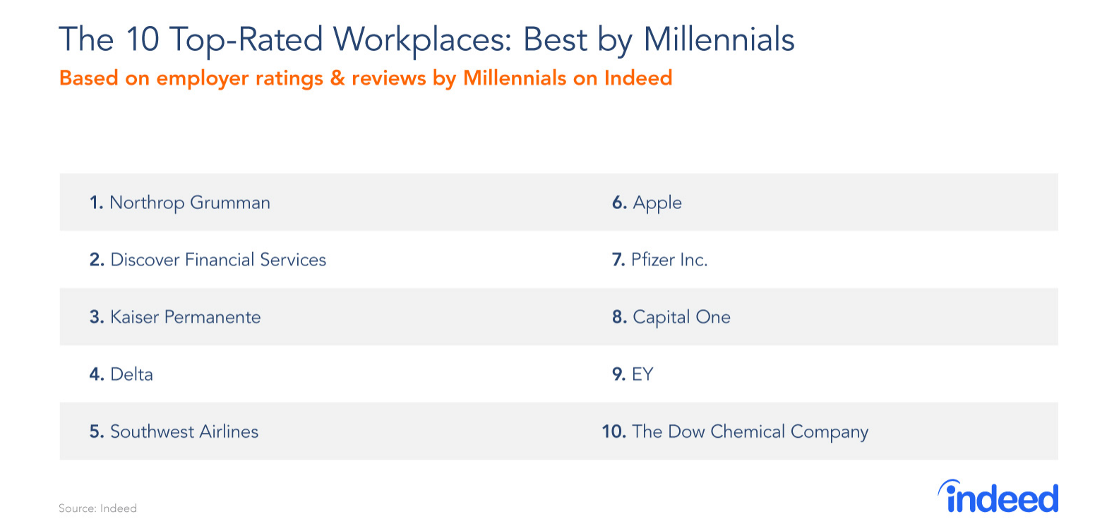 Here is the full list of millennials' best-rated workplaces from Indeed:
