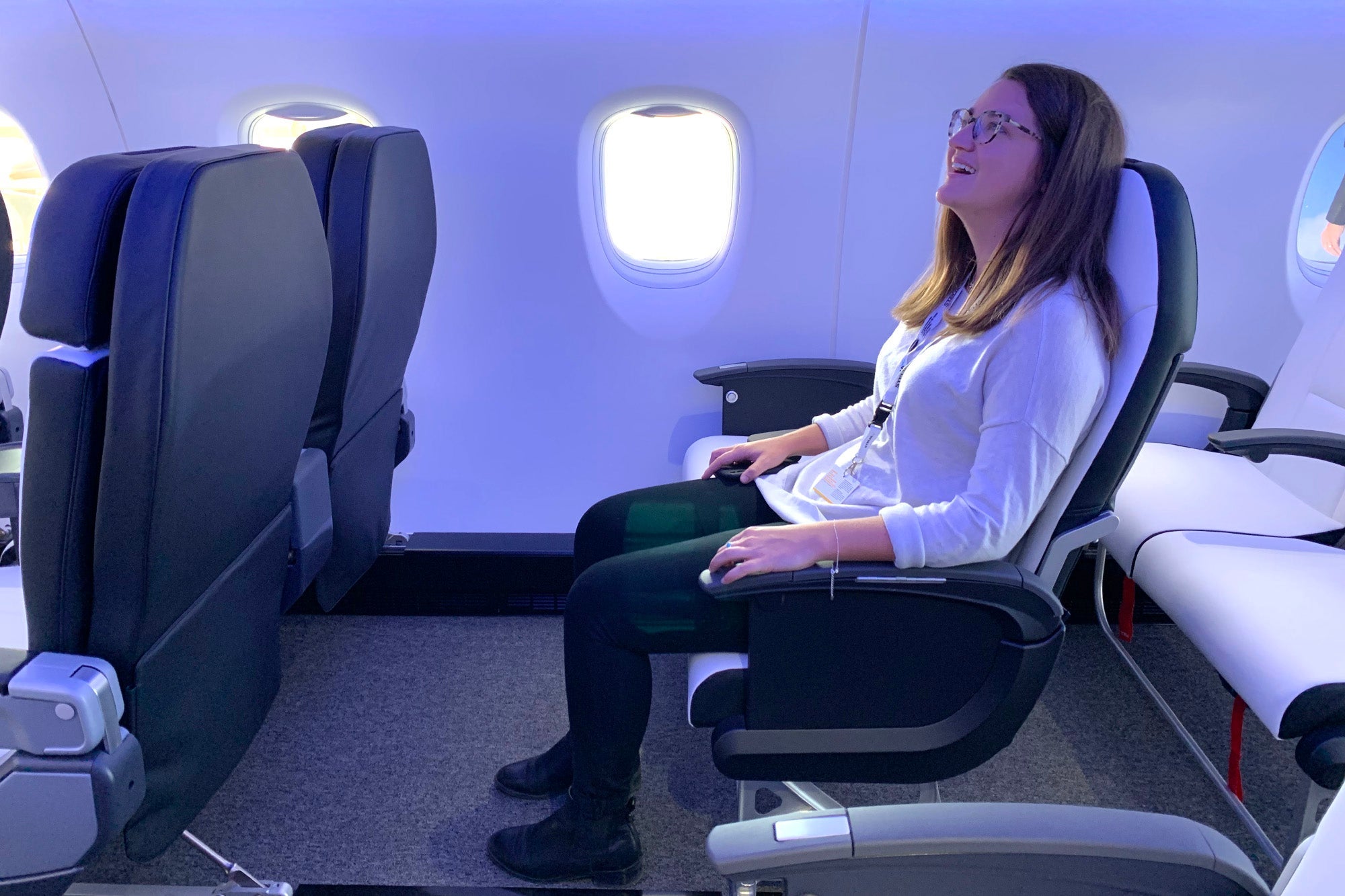 TPG's 5-foot-7-inch global news editor Emily McNutt had a chance to try out a few different seating configurations, starting with what Mitsubishi is calling "Premium Economy Class" — essentially regular coach, but with far more legroom.