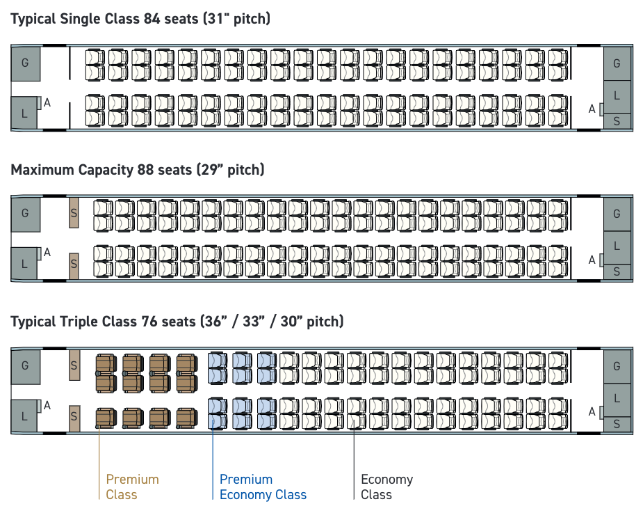 The plane will be available in a variety of seating arrangements, though a US airline pilot agreement, known as the "scope clause," generally limits regional jet configurations to 76 seats for US-based carriers, represented by the three-class configuration below.