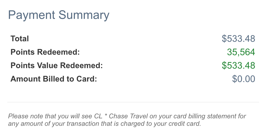 Our four Spirit Airlines tickets were only $533 total if paid with cash, and we could have even shaved some money off that amount had we booked the tickets at the airport. While that's a very reasonable amount to spend for four round-trip tickets, at the end of the day it is still 533 very real dollars. Instead of spending that money, I spent 35,564 Chase Ultimate Rewards points at a fixed value of 1.5 cents each via my Chase Sapphire Reserve to book the flights on the Chase travel site. With the press of a button, I turned my crazy idea into an actual booking without any hit to our budget's bottom line.