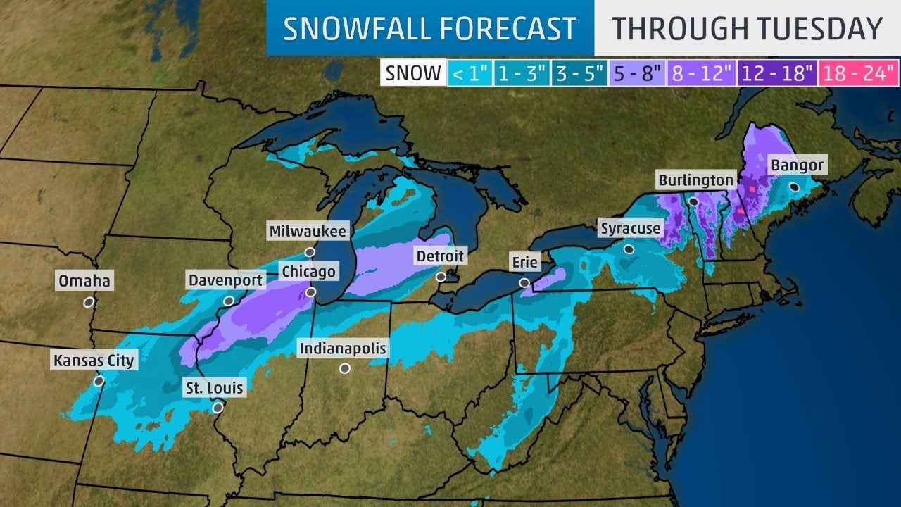 And many more cancellations are likely to follow as the storm is forecast to sweep across the Great Lakes region and upper Northeast on Monday and Tuesday — with more than 18 inches of snow forecast in parts of the country: