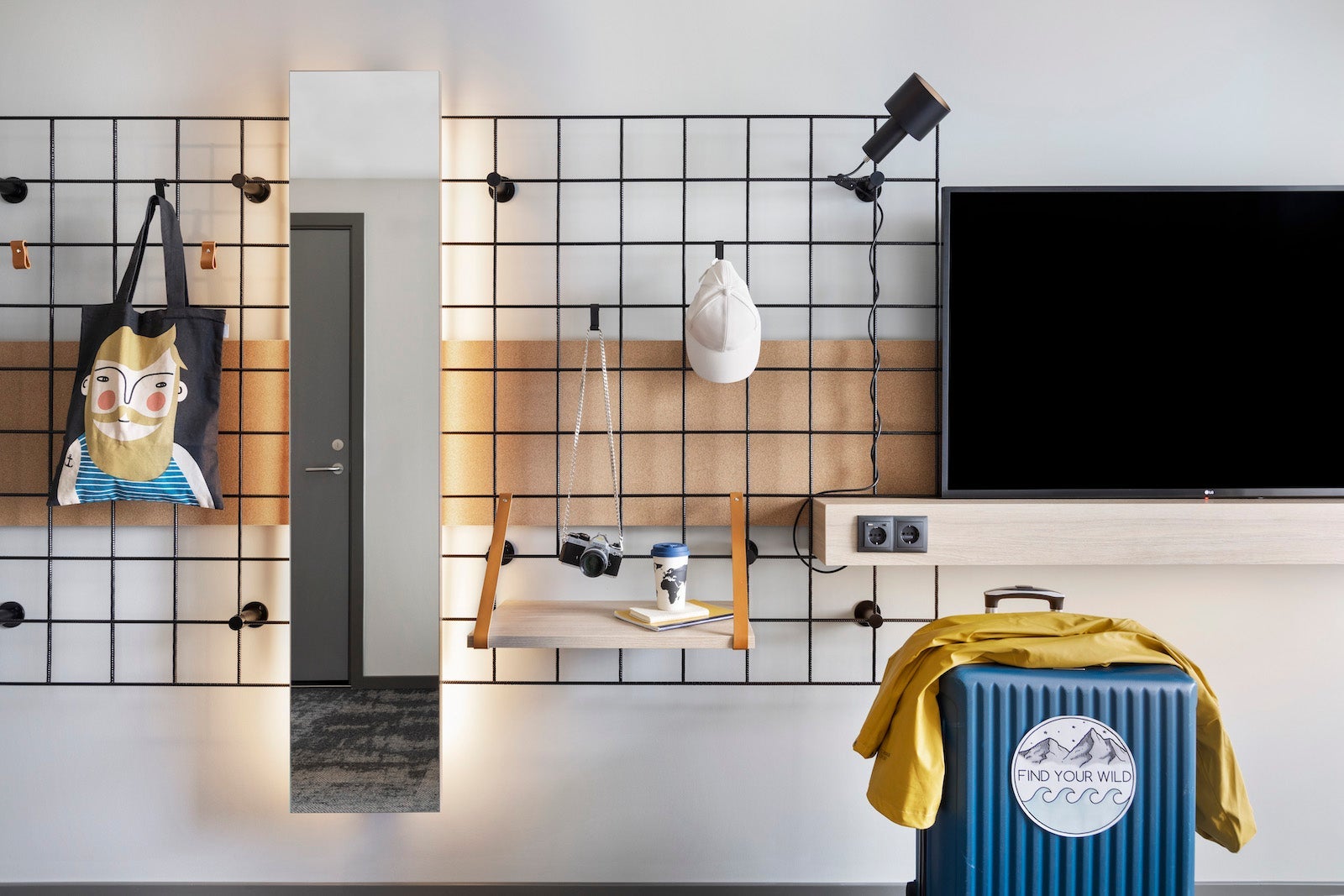 Armed with that knowledge, the Marriott team got creative and came up with "small but smart" rooms that typically measure around 185 square feet. Instead of a closet, Moxy introduced simple peg boards where guests can hang clothes or a bag. Rather than a full-on desk, some rooms offer small fold-up options that double as wall art. And in the bathroom, guests will find solid walk-in showers to wash away a day or night out on the town.