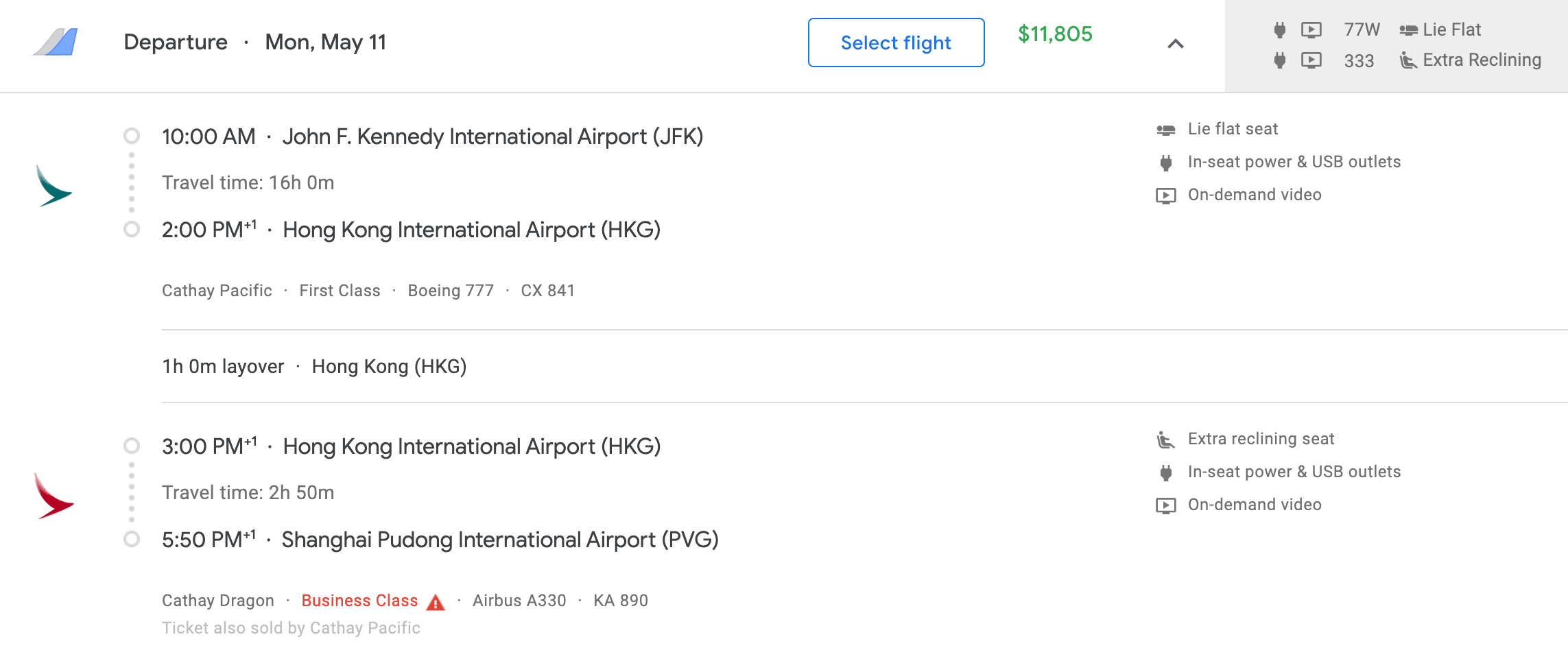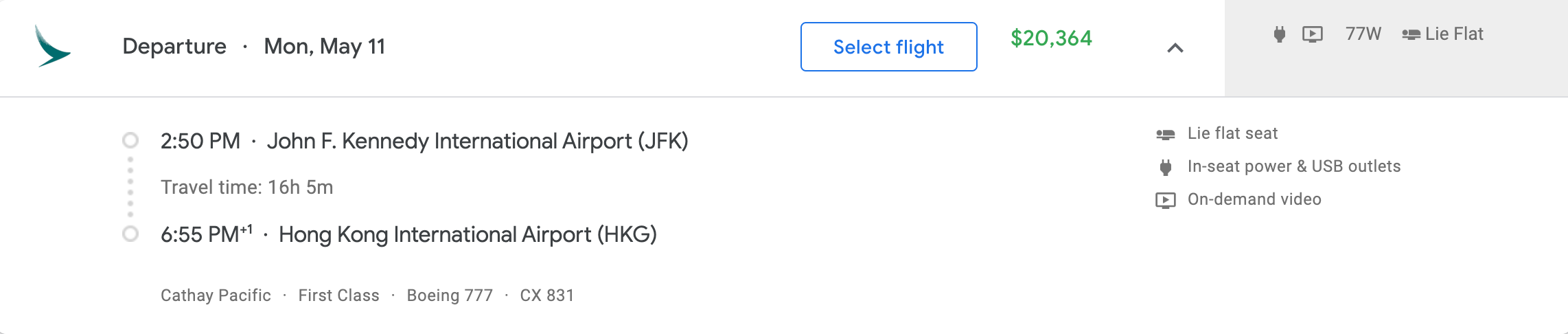 However even before the pandemic began, the ongoing protests in Hong Kong had weighed heavily on Cathay Pacific's financial situation, cutting the cash price of the ticket nearly in half. At the beginning of the year you could book a one-way first class ticket from JFK to Shanghai for $11,805, or roughly 16.75 cents per point.
