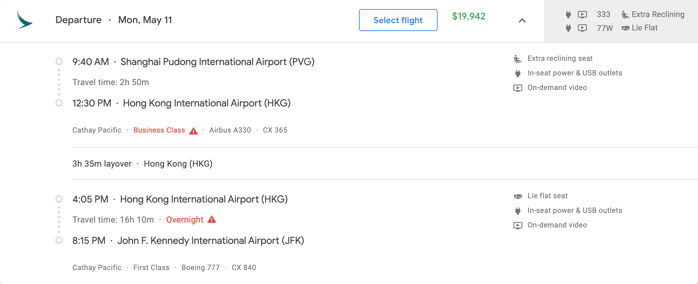 At the same time that I was supposed to be taking off from JFK to fly back to Shanghai, a Cathay Pacific flight would have been taking off from Shanghai to complete the journey back to New York, with a stop in Hong Kong. The cost of a first class ticket on that journey? An outrageously expensive $19,942. Note this ticket is identical to my east-to-west itinerary, with the minor caveat that the inter-Asia flight between Hong Kong and Shanghai is operated by a Cathay Dragon A330 instead of a mainline Cathay Pacific A330.