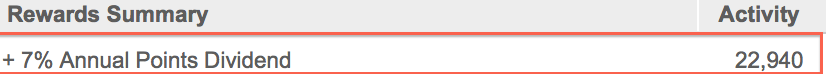 Another great perk of the card is that you get a 7% annual dividend on all the points you accrue during the year (excluding the sign-up bonus, but including all regular 2x bonus points). The 7% dividend posts with your February statement, so mine just closed last week and I noticed a nice bonus of 22,940 Ultimate Rewards points. I value my UR points at just about 2 cents a pop, so this 7% bonus is worth about $459 to me - more than making up for the $95 annual fee (which is waived the first year).