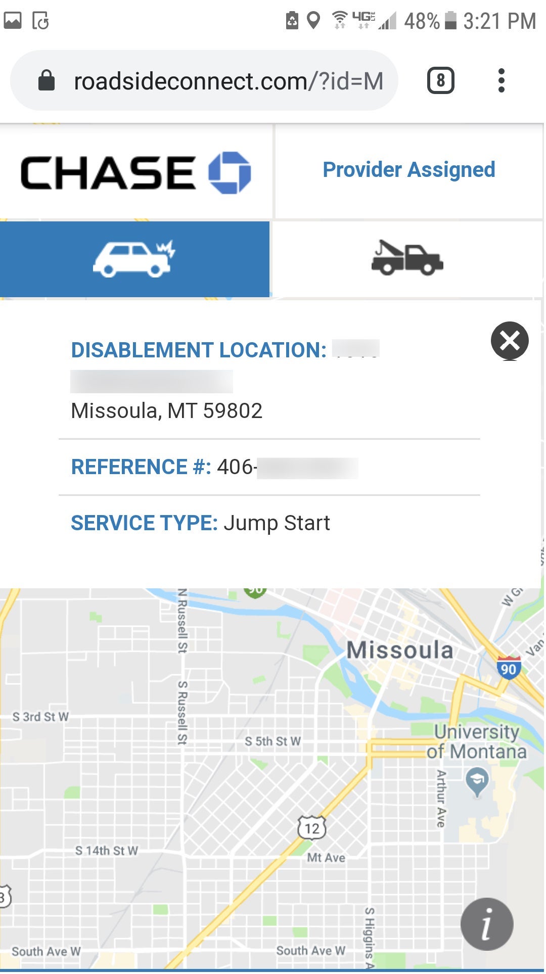 First, I called Chase's roadside assistance at 1-866-860-7978. I was connected to an agent who said she'd confirmed that I was a Chase Sapphire Reserve cardholder through my phone number, then asked for the details of my issue. I told her my battery was dead and she said I'd be receiving a text shortly, once a service provider had been assigned.
