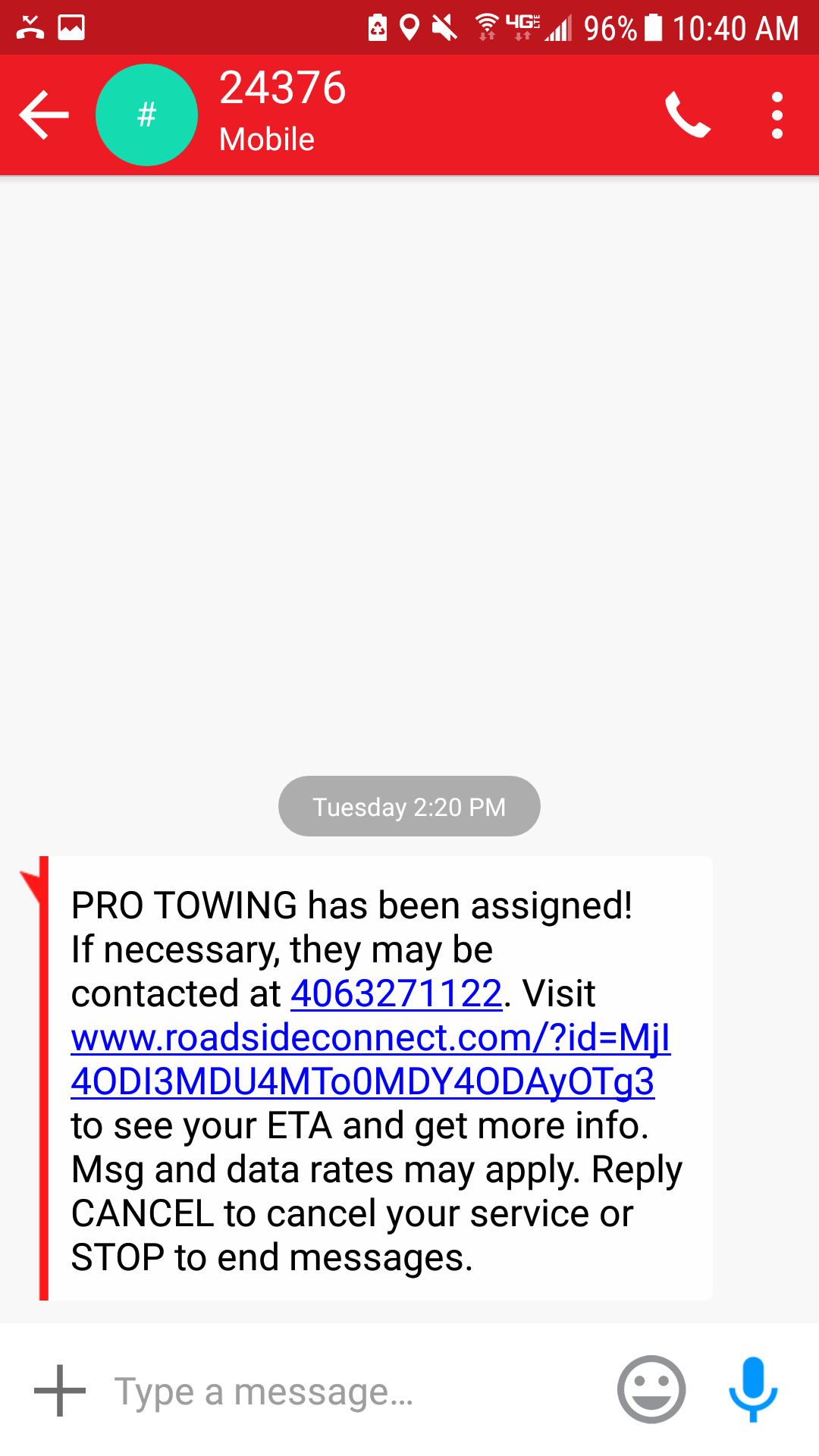 After that, I got a text confirming that a service provider had been assigned. They gave the provider's telephone number along with a link to track the progress of my service call.