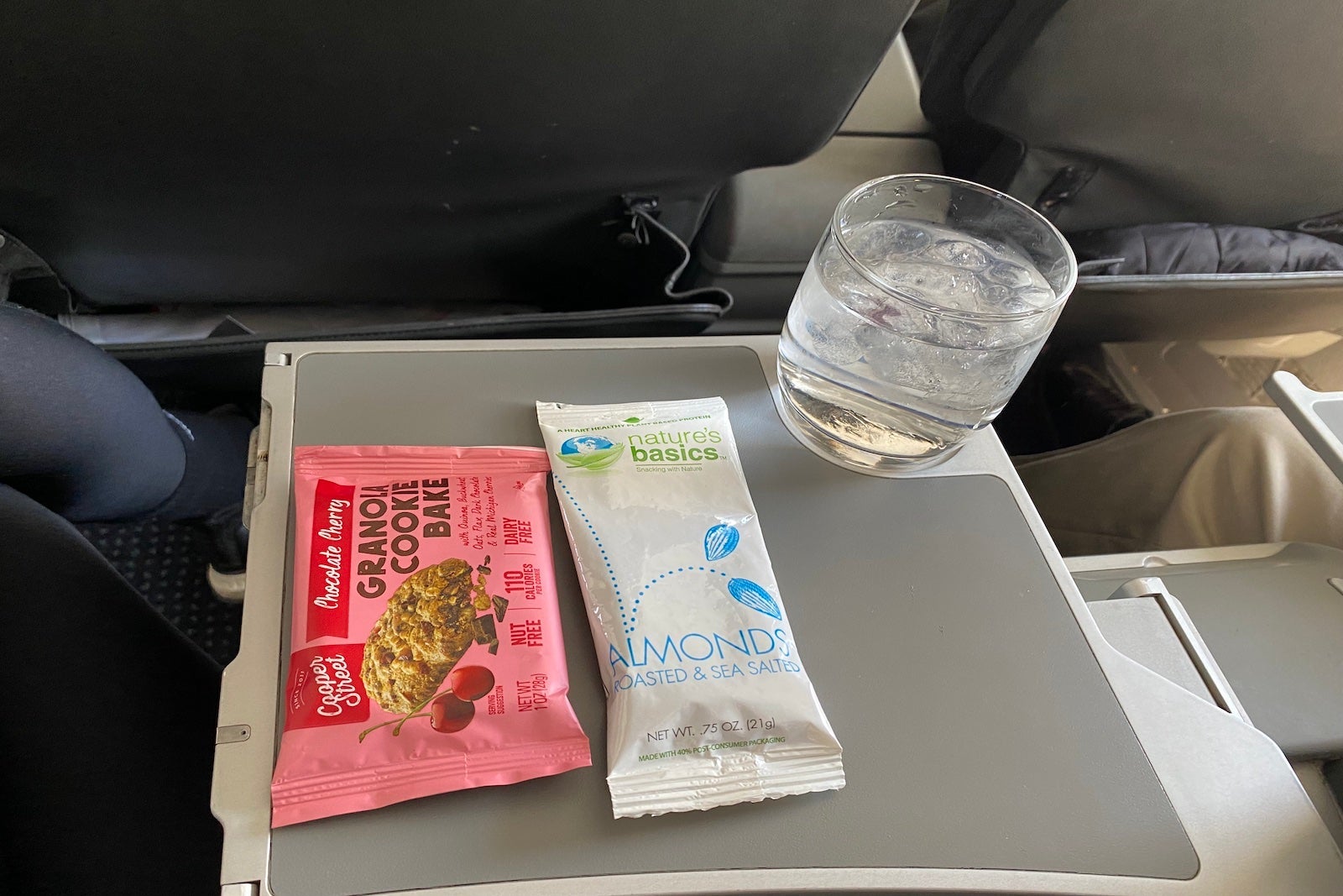 Shortly before taking off, the 12 passengers in first class were offered a predeparture beverage in a real glass. That's a big deal, per senior aviation reporter Ethan Klapper, who noted that predeparture beverages are mostly offered in plastic cups, even before the pandemic. A variety of snacks were also served after takeoff, including chips, granola bars and nuts.