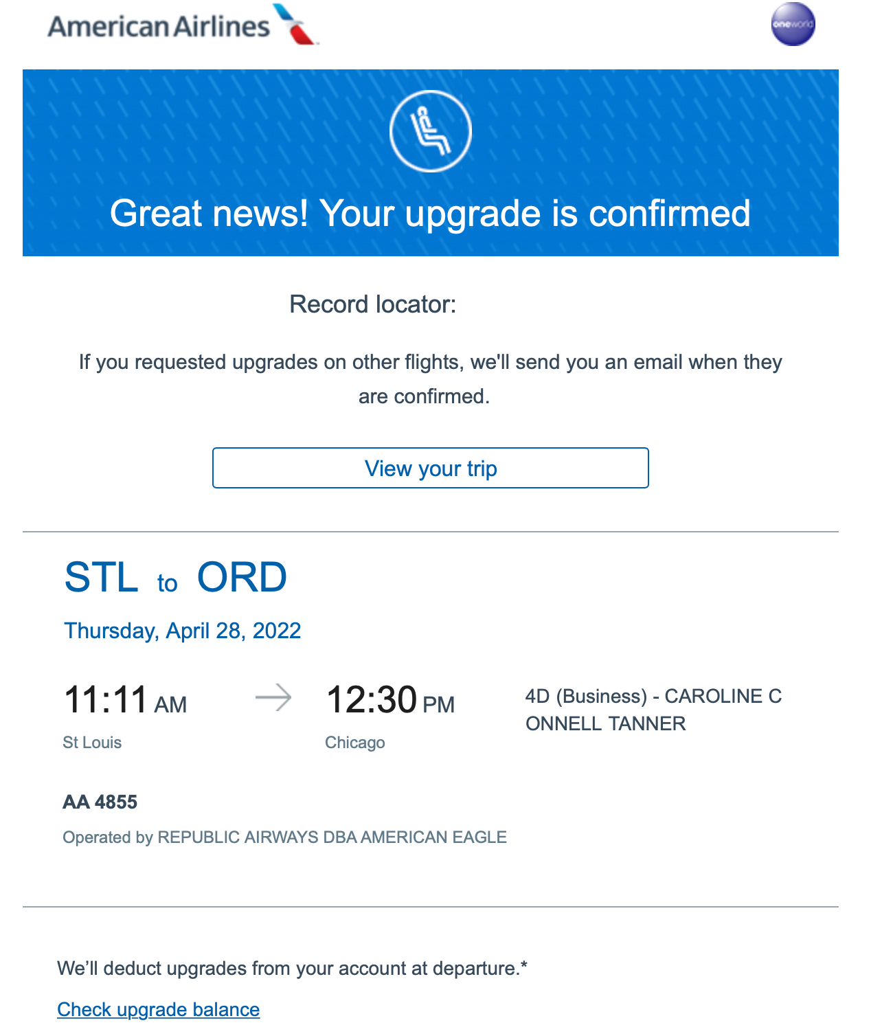 Here's how and why I was upgraded on a one-hour, 13-minute flight from St. Louis Lambert International Airport (STL) to Chicago's O'Hare International Airport (ORD).