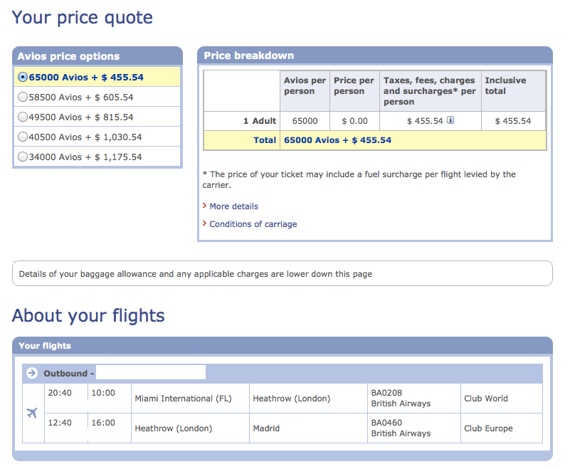 Miami to Madrid via London on British Airways business class for 65,000 Avios and $455.